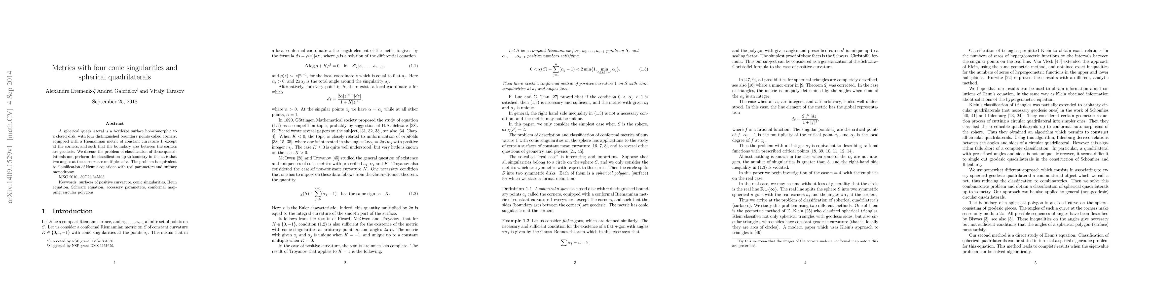 A spherical quadrilateral is a bordered surface homeomorphic to a closed disk, with four distinguished boundary points called corners, equipped with a Riemannian metric of constant curvature 1, except at the corners, and such that the boundary arcs between the corners are geodesic. We discuss the problem of classification of these quadrilaterals and perform the classification up to isometry in the case that two angles at the corners are multiples of pi. The problem is equivalent to classification of Heun's equations with real parameters and unitary monodromy.