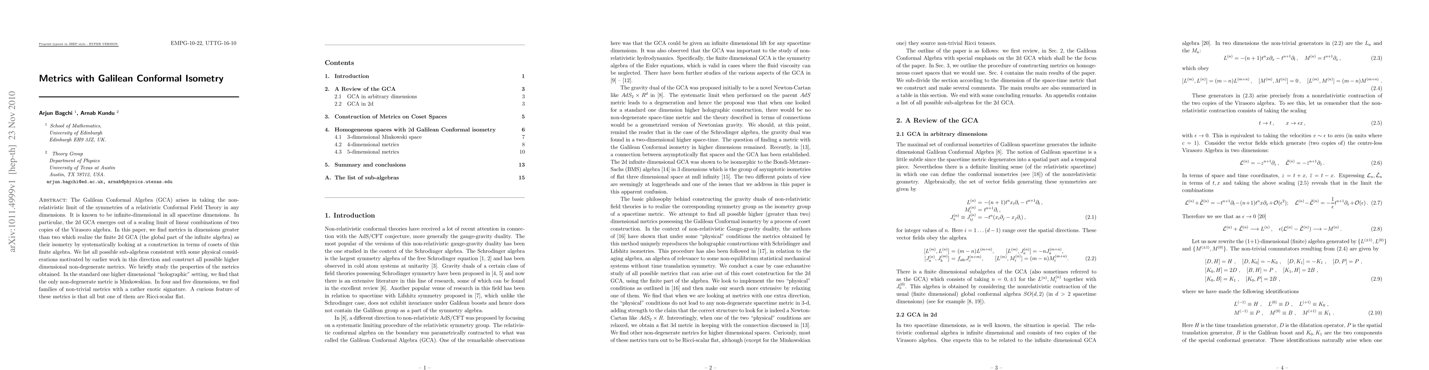 The Galilean Conformal Algebra (GCA) arises in taking the non-relativistic limit of the symmetries of a relativistic Conformal Field Theory in any dimensions. It is known to be infinite-dimensional in all spacetime dimensions. In particular, the 2d GCA emerges out of a scaling limit of linear combinations of two copies of the Virasoro algebra. In this paper, we find metrics in dimensions greater than two which realize the finite 2d GCA (the global part of the infinite algebra) as their isometry by systematically looking at a construction in terms of cosets of this finite algebra. We list all possible sub-algebras consistent with some physical considerations motivated by earlier work in this direction and construct all possible higher dimensional non-degenerate metrics. We briefly study the properties of the metrics obtained. In the standard one higher dimensional "holographic" setting, we find that the only non-degenerate metric is Minkowskian. In four and five dimensions, we find families of non-trivial metrics with a rather exotic signature. A curious feature of these metrics is that all but one of them are Ricci-scalar flat.
