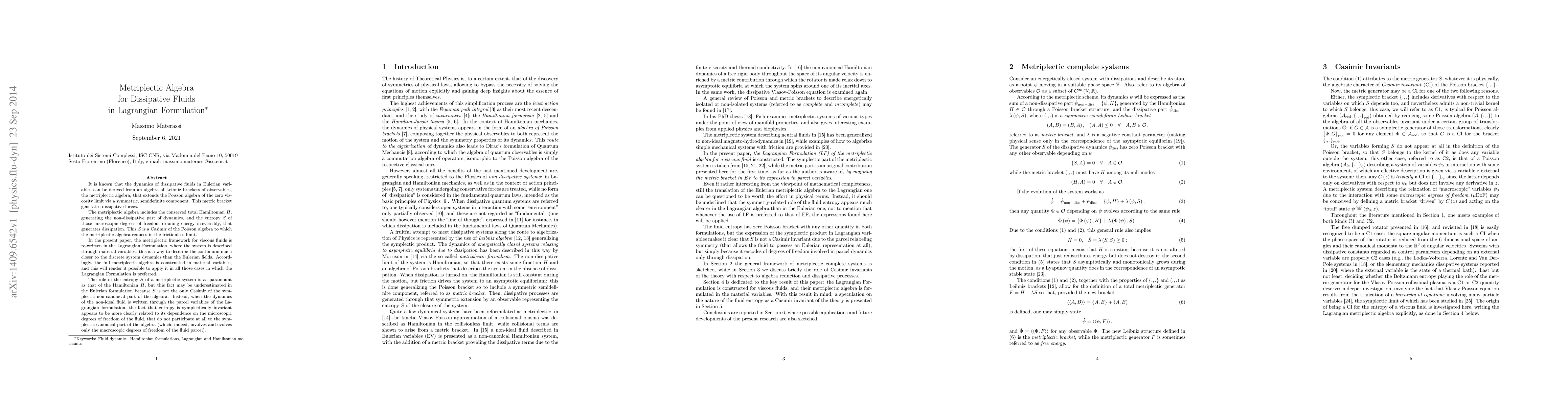 This paper reformulates the metriplectic algebra for dissipative fluids in the Lagrangian framework, emphasizing the role of entropy alongside the Hamiltonian. It constructs the full metriplectic algebra in material variables to better align with discrete system dynamics and highlights the symplectic invariance of entropy in this formulation.