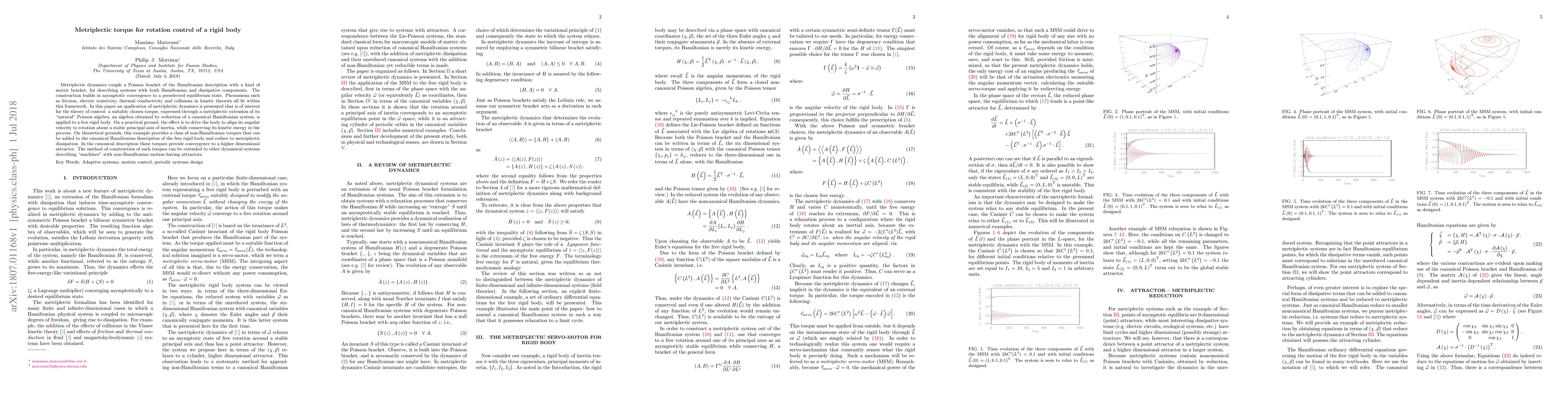 Metriplectic dynamics couple a Poisson bracket of the Hamiltonian description with a kind of metric bracket, for describing systems with both Hamiltonian and dissipative components. The construction builds in asymptotic convergence to a preselected equilibrium state. Phenomena such as friction, electric resistivity, thermal conductivity and collisions in kinetic theories all fit within this framework. In this paper an application of metriplectic dynamics is presented that is of interest for the theory of control: a suitably chosen torque, expressed through a metriplectic extension of its "natural" Poisson algebra, an algebra obtained by reduction of a canonical Hamiltonian system, is applied to a free rigid body. On a practical ground, the effect is to drive the body to align its angular velocity to rotation about a stable principal axis of inertia, while conserving its kinetic energy in the process. On theoretical grounds, this example provides a class of non-Hamiltonian torques that can be added to the canonical Hamiltonian description of the free rigid body and reduce to metriplectic dissipation. In the canonical description these torques provide convergence to a higher dimensional attractor. The method of construction of such torques can be extended to other dynamical systems describing "machines" with non-Hamiltonian motion having attractors.