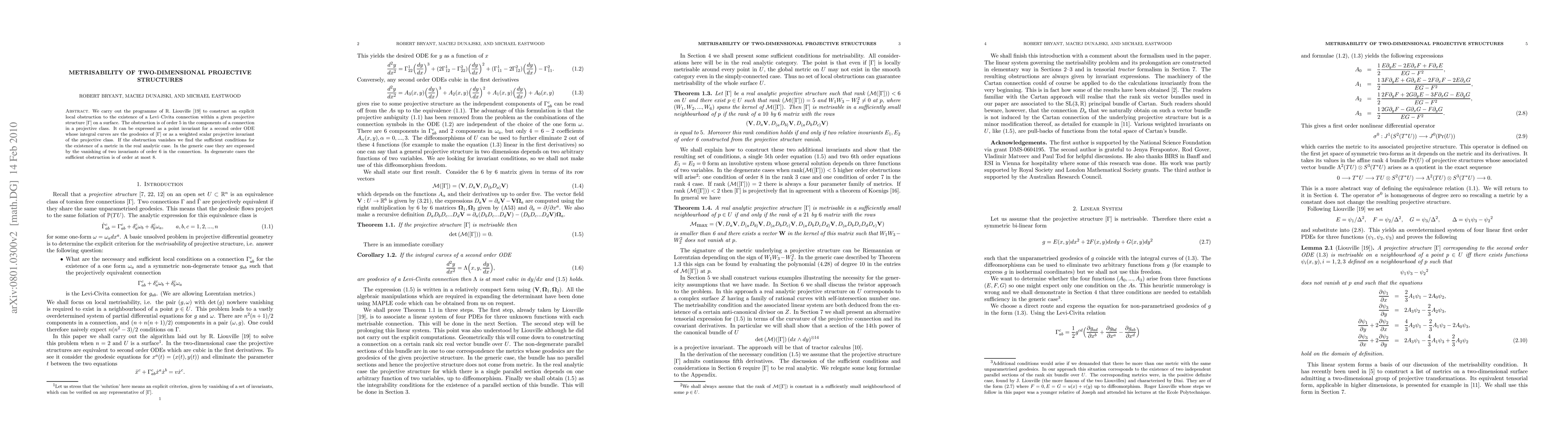 We carry out the programme of R. Liouville \cite{Liouville} to construct an explicit local obstruction to the existence of a Levi--Civita connection within a given projective structure $[\Gamma]$ on a surface. The obstruction is of order 5 in the components of a connection in a projective class. It can be expressed as a point invariant for a second order ODE whose integral curves are the geodesics of $[\Gamma]$ or as a weighted scalar projective invariant of the projective class. If the obstruction vanishes we find the sufficient conditions for the existence of a metric in the real analytic case. In the generic case they are expressed by the vanishing of two invariants of order 6 in the connection. In degenerate cases the sufficient obstruction is of order at most 8.