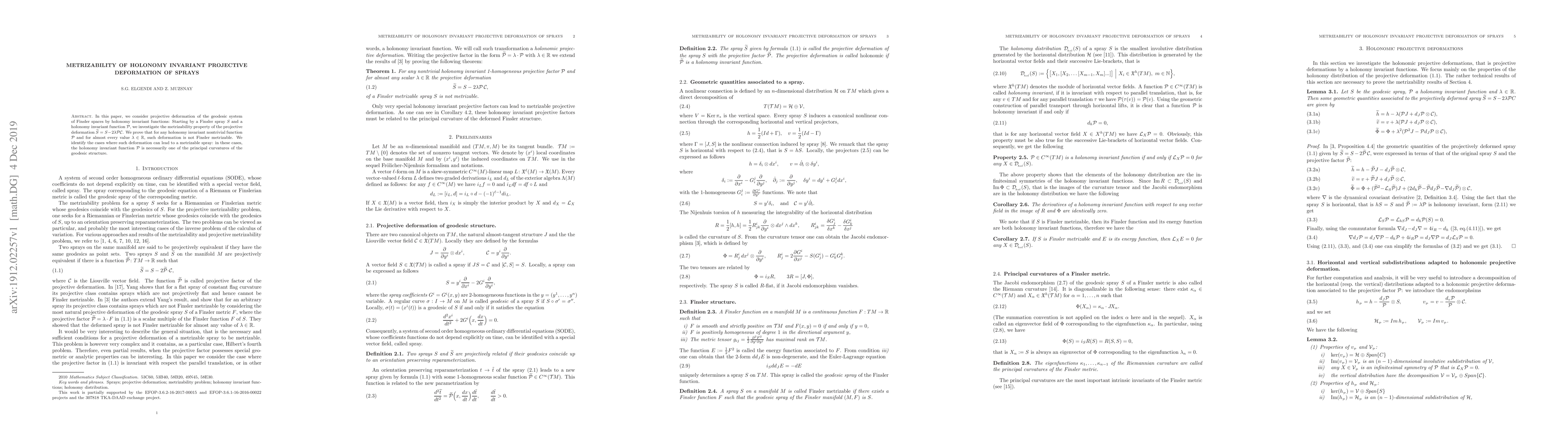 This paper investigates the metrizability of projective deformations of Finsler sprays using holonomy invariant functions, proving that such deformations are generally not metrizable unless the invariant function is a principal curvature.