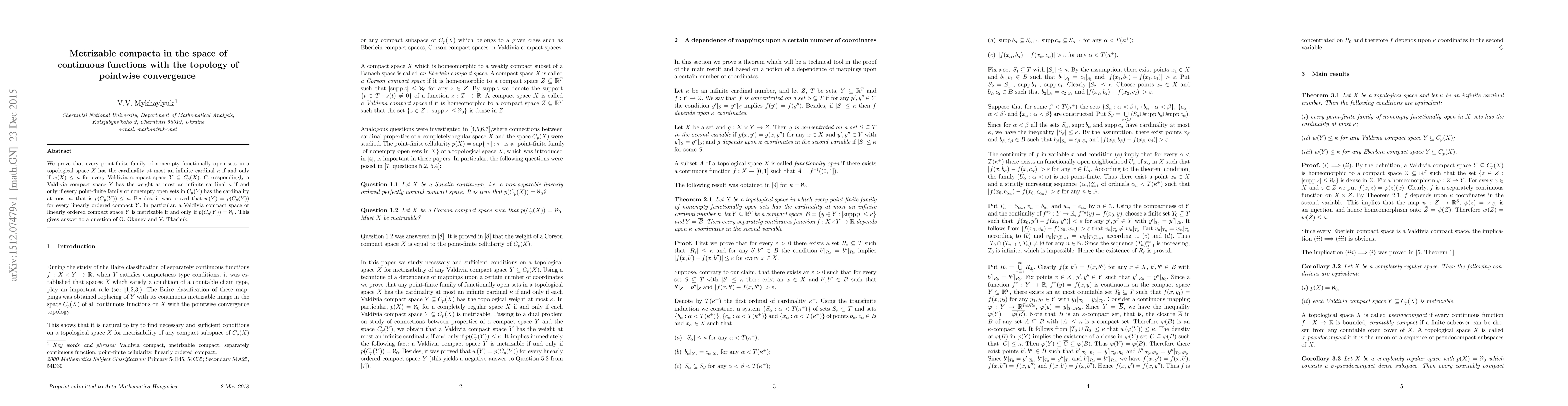 We prove that every point-finite family of nonempty functionally open sets in a topological space $X$ has the cardinality at most an infinite cardinal $\kappa$ if and only if $w(X)\leq\kappa$ for every Valdivia compact space $Y\subseteq C_p(X)$. Correspondingly a Valdivia compact space $Y$ has the weight at most an infinite cardinal $\kappa$ if and only if every point-finite family of nonempty open sets in $C_p(Y)$ has the cardinality at most $\kappa$, that is $p(C_p(Y))\leq \kappa$. Besides, it was proved that $w(Y)=p(C_p(Y))$ for every linearly ordered compact $Y$. In particular, a Valdivia compact space or linearly ordered compact space $Y$ is metrizable if and only if $p(C_p(Y))=\aleph_0$. This gives answer to a question of O.~Okunev and V.~Tkachuk.