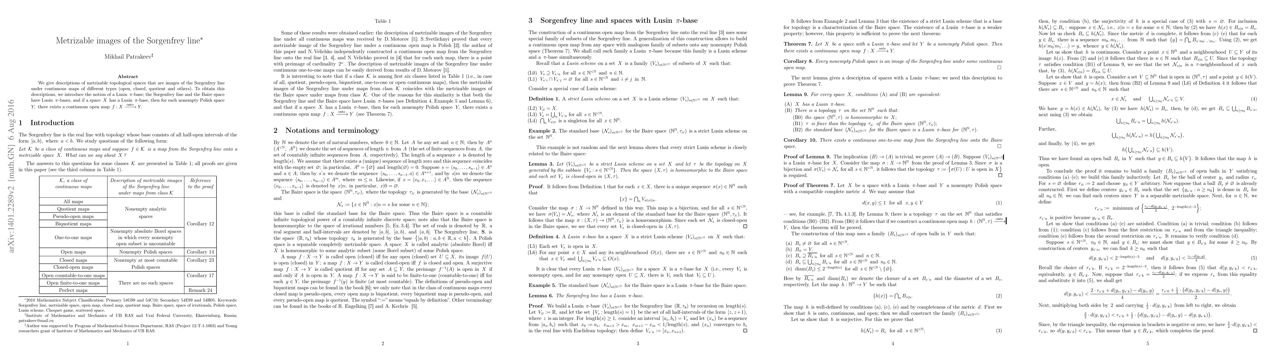 This paper characterizes metrizable topological spaces that arise as images of the Sorgenfrey line under various types of continuous maps. It introduces the concept of a Lusin pi-base to demonstrate that the Sorgenfrey line and the Baire space have such bases, which facilitate the existence of continuous open maps from these spaces onto any nonempty Polish space.
