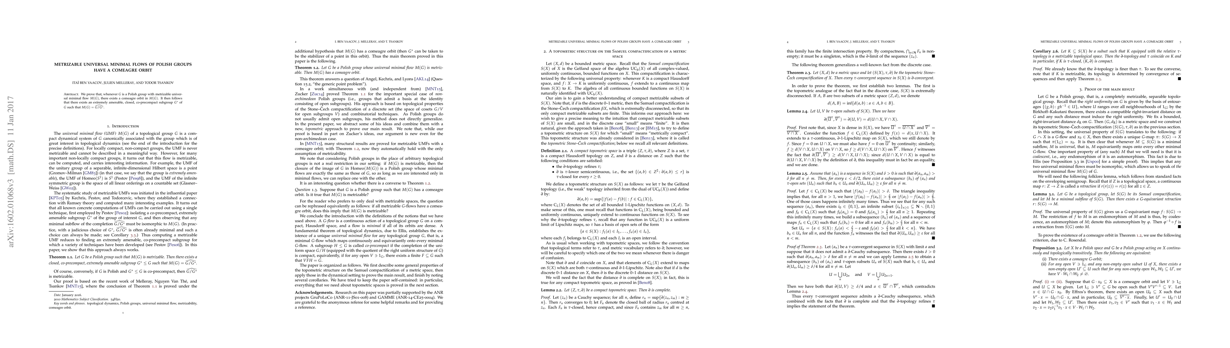Summary: This paper proves that Polish groups with metrizable universal minimal flows possess a comeagre orbit, leading to the existence of an extremely amenable, closed, coprecompact subgroup $G^*$ such that the universal minimal flow is isomorphic to the quotient group $\hat{G/G^*}$.