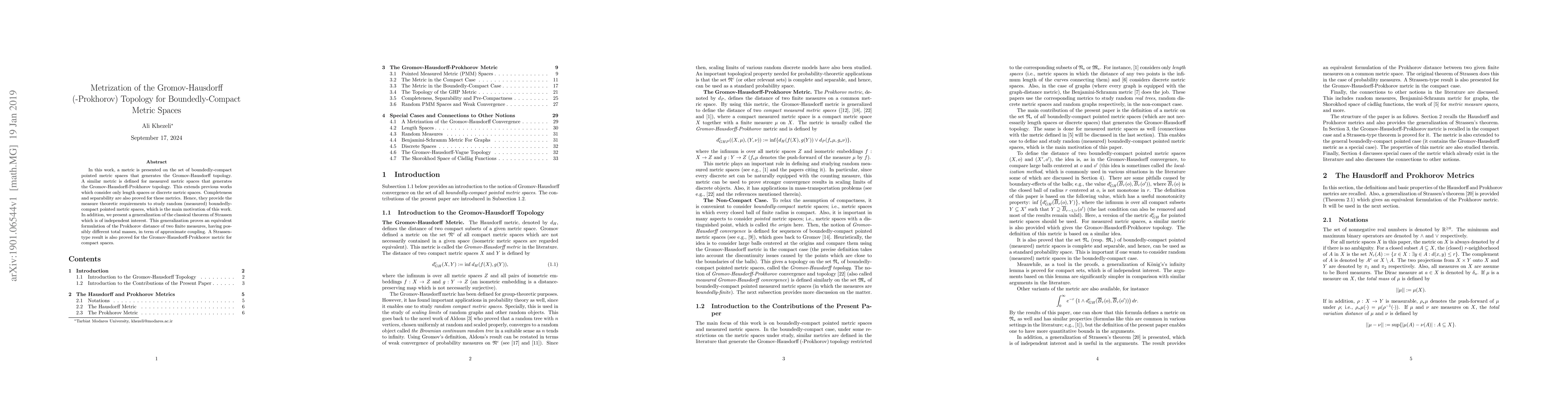 The paper introduces a new metric on boundedly-compact pointed metric spaces and extends it to measured metric spaces, providing a metrization for the Gromov-Hausdorff-Prokhorov topology, along with proofs of completeness and separability.