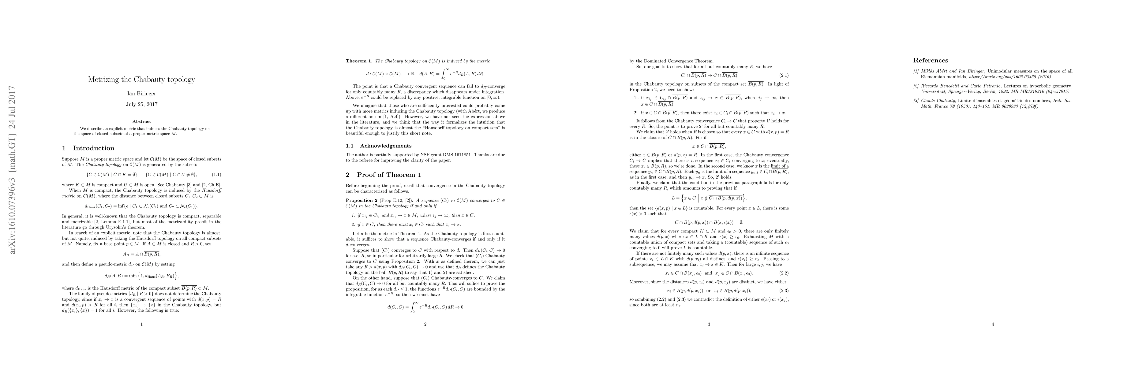We describe an explicit metric that induces the Chabauty topology on the space of closed subsets of a proper metric space M.