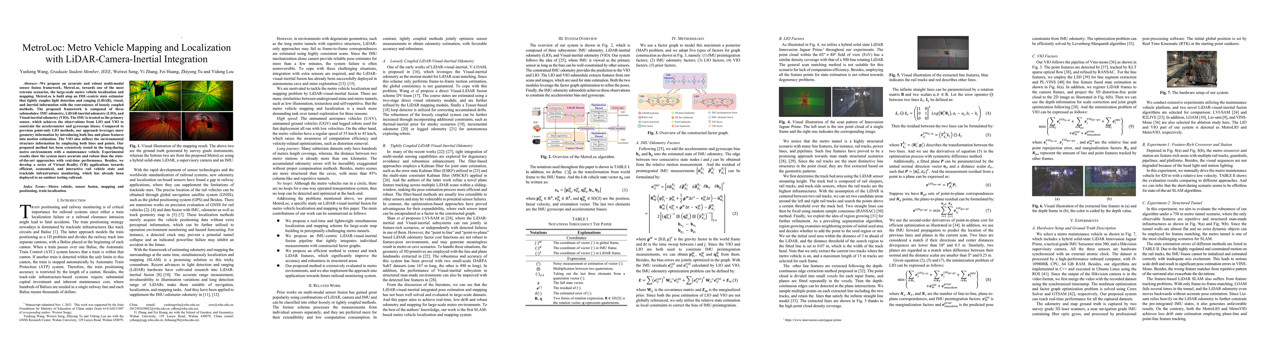 MetroLoc integrates LiDAR, camera, and inertial sensors to achieve precise metro vehicle localization and mapping through multi-modal sensor fusion. The framework, built on an IMU-centric state estimator, combines IMU odometry with LiDAR and visual odometry to enhance accuracy and robustness, outperforming existing methods in metro environments.