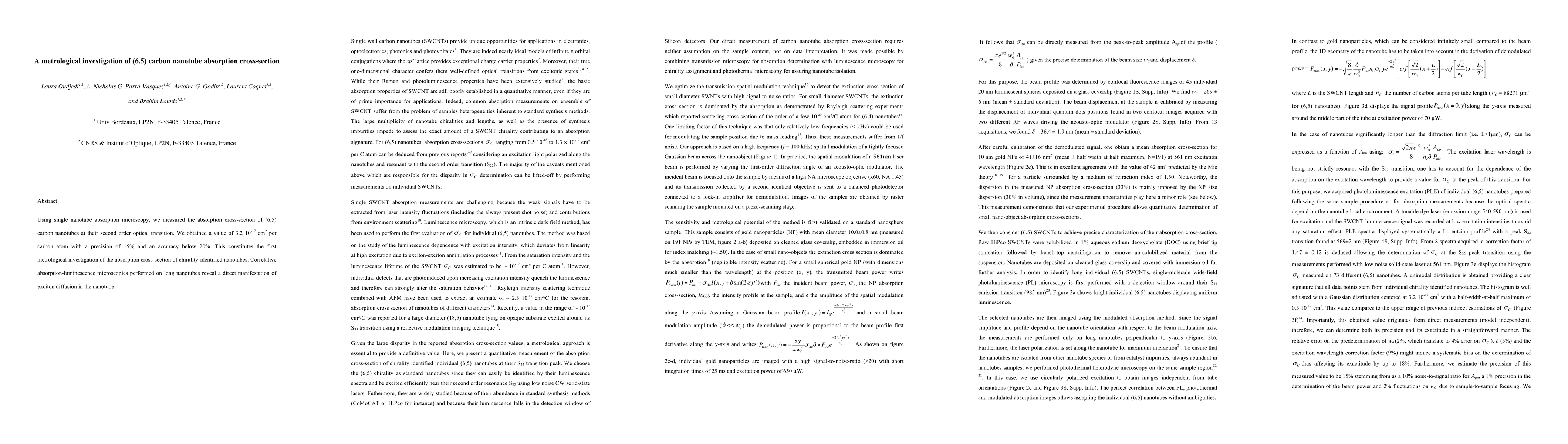 This study measures the absorption cross section of (6,5) carbon nanotubes using single-nanotube absorption microscopy, yielding a value of 3.2 x 10^-17 cm²/C atom with 15% precision and <20% accuracy, marking the first such metrological investigation for identified chirality nanotubes. Correlative studies show exciton diffusion in the nanotubes.