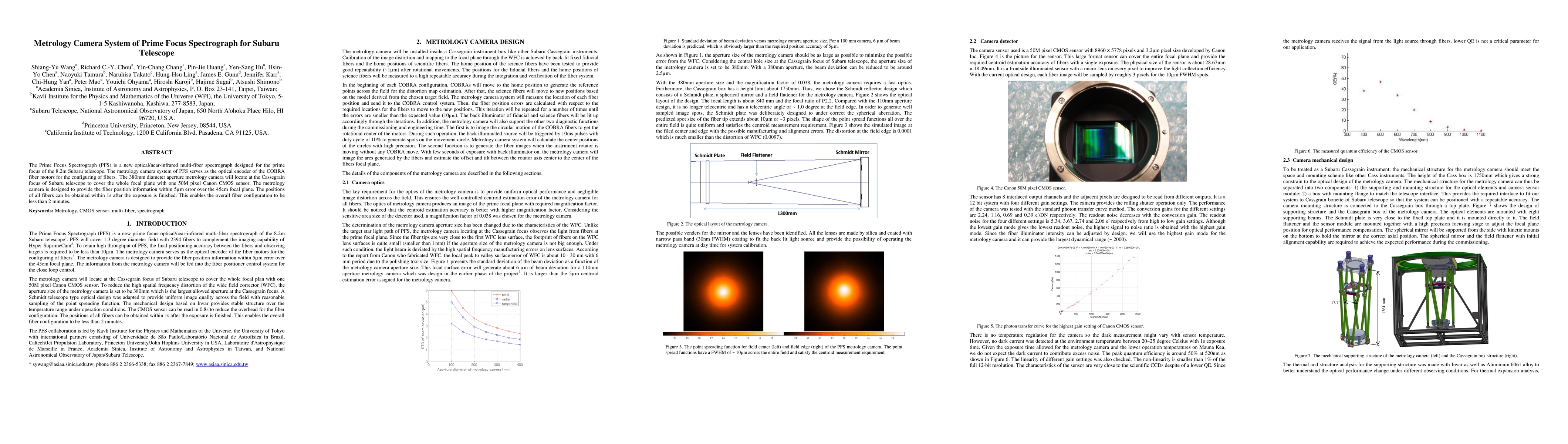 The Prime Focus Spectrograph (PFS) uses a metrology camera system at the Cassegrain focus of the Subaru telescope to configure fiber positions with a 5μm accuracy over a 45cm focal plane, enabling fiber setup in less than 2 minutes. The system employs a 50M pixel Canon CMOS sensor to achieve this precision.