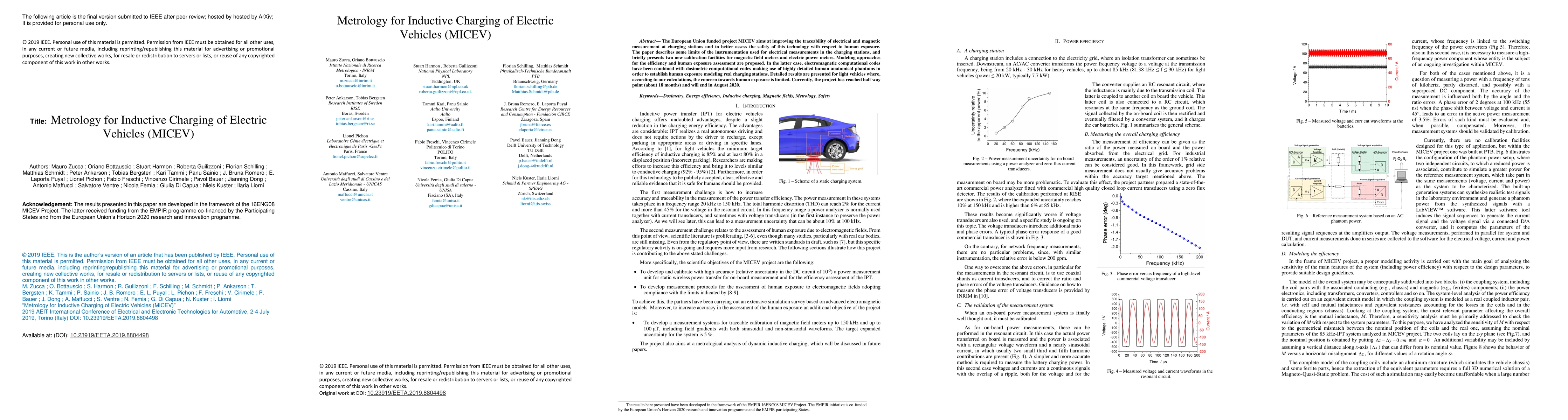 The MICEV project enhances the traceability and safety of inductive charging for electric vehicles by developing new calibration facilities and modeling approaches for efficiency and human exposure. Preliminary results indicate limited human exposure concerns, with detailed findings for light vehicles.