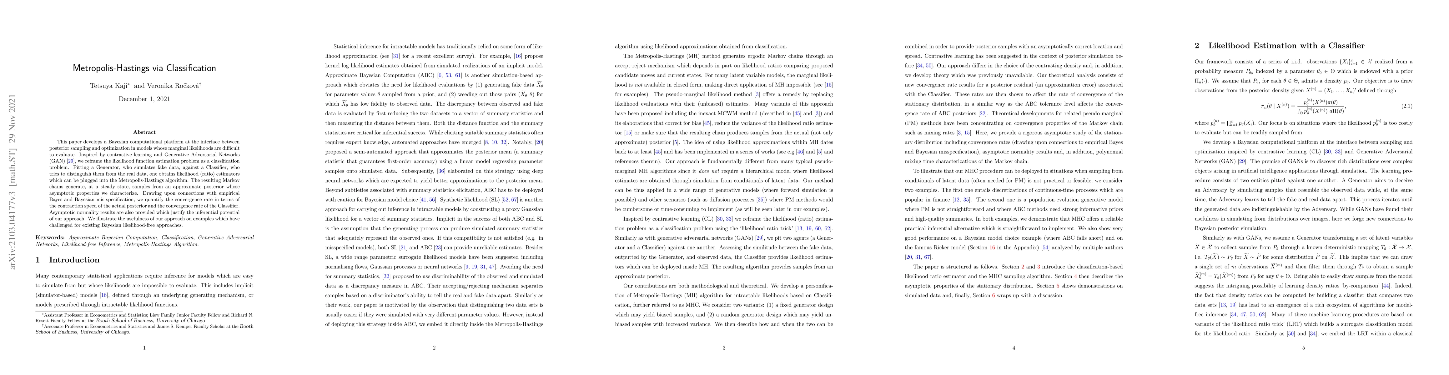 This paper develops a Bayesian computational platform at the interface between posterior sampling and optimization in models whose marginal likelihoods are difficult to evaluate. Inspired by adversarial optimization, namely Generative Adversarial Networks (GAN), we reframe the likelihood function estimation problem as a classification problem. Pitting a Generator, who simulates fake data, against a Classifier, who tries to distinguish them from the real data, one obtains likelihood (ratio) estimators which can be plugged into the Metropolis-Hastings algorithm. The resulting Markov chains generate, at a steady state, samples from an approximate posterior whose asymptotic properties we characterize. Drawing upon connections with empirical Bayes and Bayesian mis-specification, we quantify the convergence rate in terms of the contraction speed of the actual posterior and the convergence rate of the Classifier. Asymptotic normality results are also provided which justify inferential potential of our approach. We illustrate the usefulness of our approach on examples which have posed a challenge for existing Bayesian likelihood-free approaches.