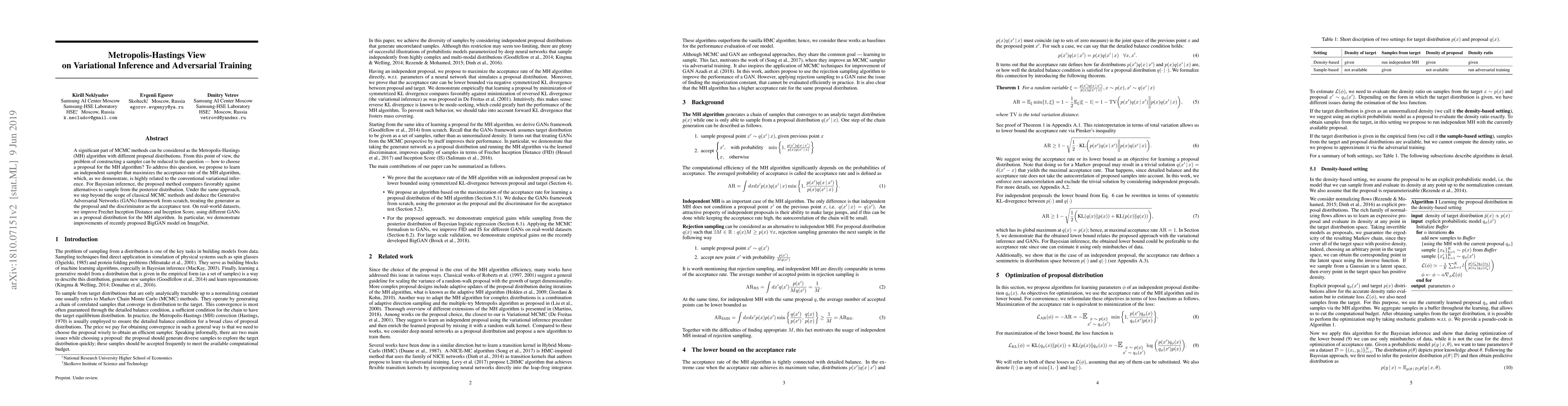 This paper proposes a method to learn an independent sampler for the Metropolis-Hastings algorithm that maximizes the acceptance rate, linking it to variational inference. It also extends the approach to derive Generative Adversarial Networks, treating GANs as proposal distributions in MCMC, which improves GAN performance on datasets like ImageNet.