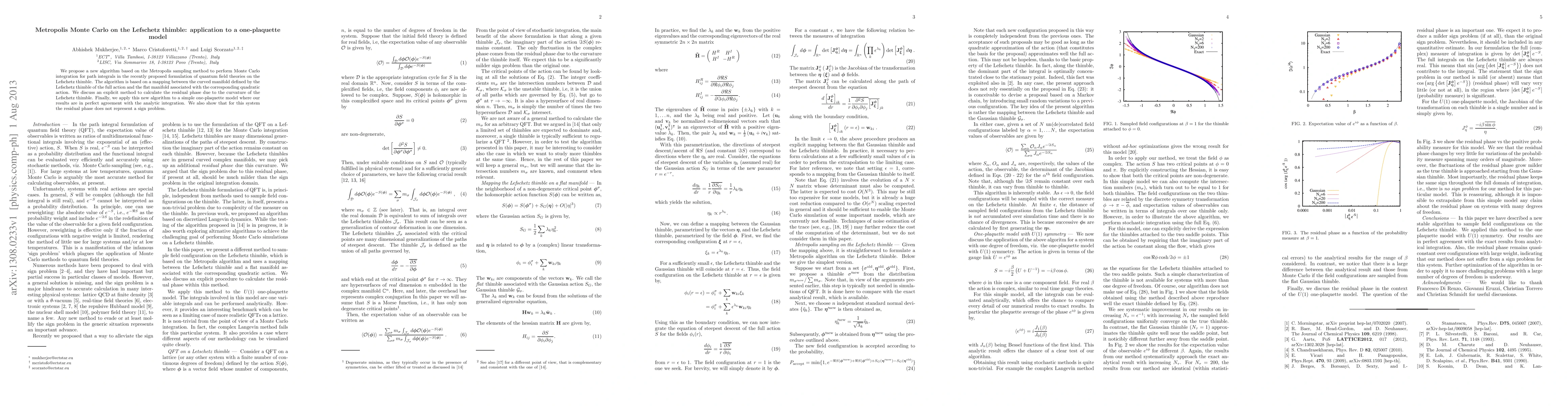 This paper introduces a Metropolis Monte Carlo algorithm for Monte Carlo integration on the Lefschetz thimble, mapping the curved manifold of the full action to a flat quadratic action. It demonstrates the method's effectiveness on a one-plaquette model, showing perfect agreement with analytic results and no sign problem due to residual phase.