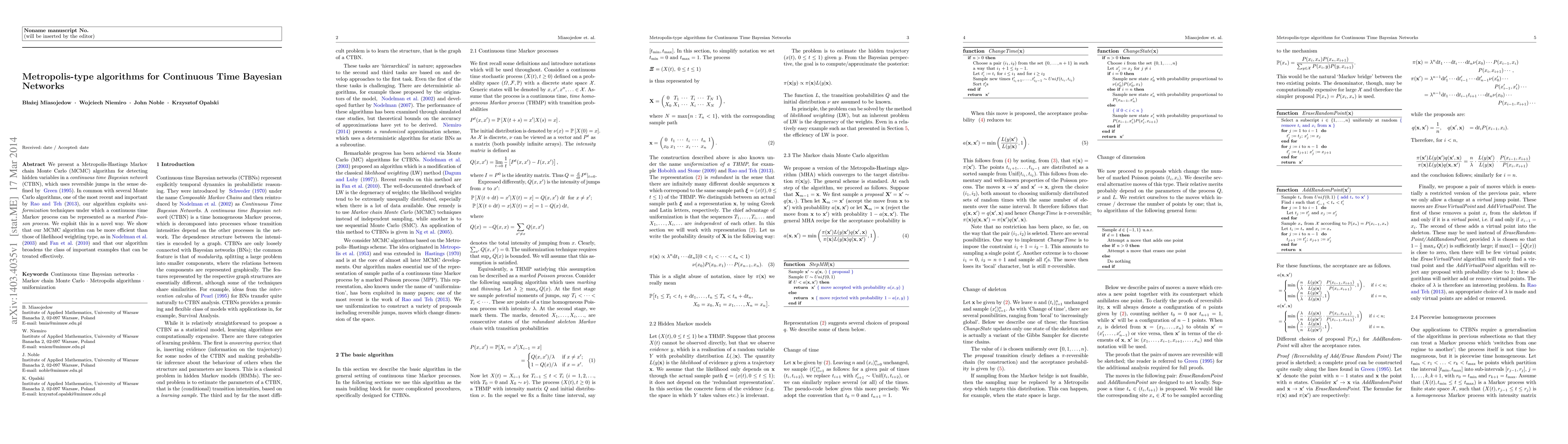 This paper introduces a Metropolis-Hastings MCMC algorithm for identifying hidden variables in continuous time Bayesian networks, utilizing reversible jumps and uniformization techniques. The proposed method is shown to be more efficient than likelihood weighting approaches and extends the range of applicable examples.