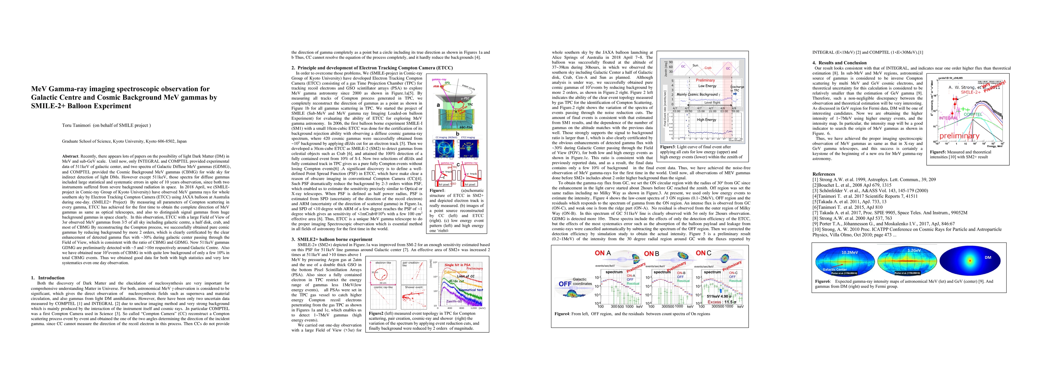 Recently, there appears lots of papers on the possibility of light Dark Matter (DM) in MeV and sub-GeV scale. Until now, only INTEGRAL and COMPTEL provided experimental data of 511keV of galactic center, and two spectra of Galactic Diffuse MeV gammas (GDMG), and COMPTEL provided the Cosmic Background MeV gammas (CBMG) for wide sky for indirect detection of light DMs. However except 511keV, those spectra for diffuse gammas included large statistical and systematic errors in spite of 10 years observation, since both two instruments suffered from severe background radiation in space. In 2018 April, we (SMILE-project in Comic-ray Group of Kyoto University) have observed MeV gamma rays for whole southern sky by Electron Tracking Compton Camera (ETCC) using JAXA balloon at Australia during one-day. (SMILE2+ Project) By measuring all parameters of Compton scattering in every gamma, ETCC has achieved for the first time to obtain the complete direction of MeV gammas as same as optical telescopes, and also to distinguish signal gammas from huge background gammas in space clearly. In this observation, ETCC with a large Field of View of 3sr observed MeV gammas from 3/5 of all sky including galactic centre, a half disk, crab, and most of CBMG By reconstructing the Compton process, we successfully obtained pure comic gammas by reducing background by more 2 orders, which is clearly certificated by the clear enhancement of detected gamma flux with ~30% during galactic center passing through the Field of View, which is consistent with the ratio of CBMG and GDMG. Now 511keV gammas GDMG are preliminarily detected with ~5 and >10 sigma respectively around Galactic Centre. Also we have obtained near 105events of CBMG in with quite low background of only a few 10% in total CBMG events. Thus we obtained good data for both with high statistics and very low systematics even one day observation.