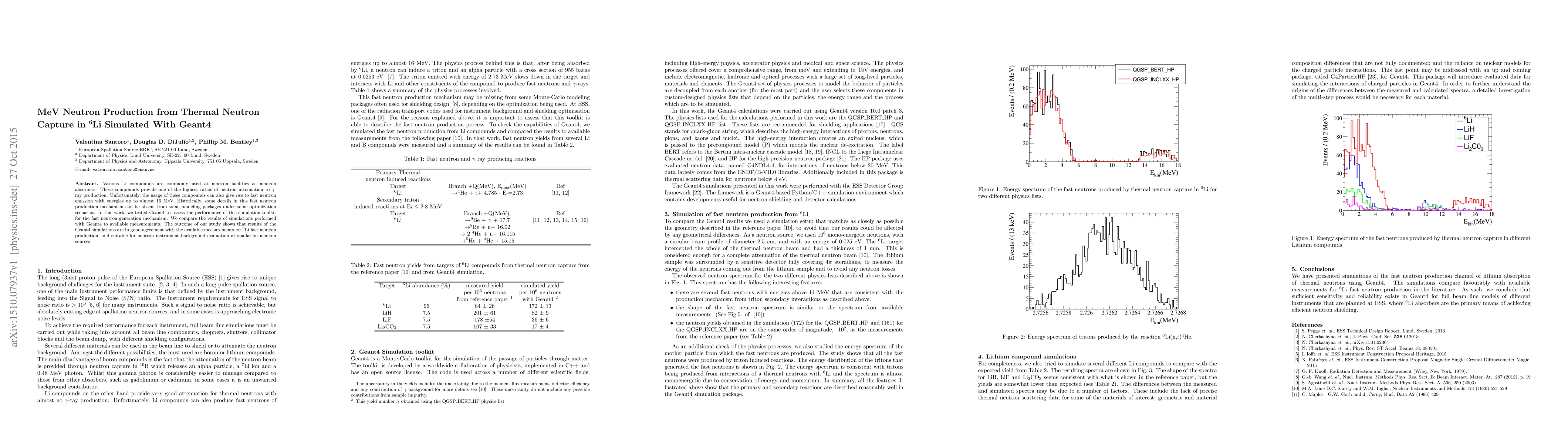Various Li compounds are commonly used at neutron facilities as neutron absorbers. These compounds provide one of the highest ratios of neutron attenuation to $\gamma$-ray production. Unfortunately, the usage of these compounds can also give rise to fast neutron emission with energies up to almost 16 MeV. Historically, some details in this fast neutron production mechanism can be absent from some modeling packages under some optimization scenarios. In this work, we tested Geant4 to assess the performance of this simulation toolkit for the fast neutron generation mechanism. We compare the results of simulations performed with Geant4 to available measurements. The outcome of our study shows that results of the Geant4 simulations are in good agreement with the available measurements for $^6$Li fast neutron production, and suitable for neutron instrument background evaluation at spallation neutron sources.