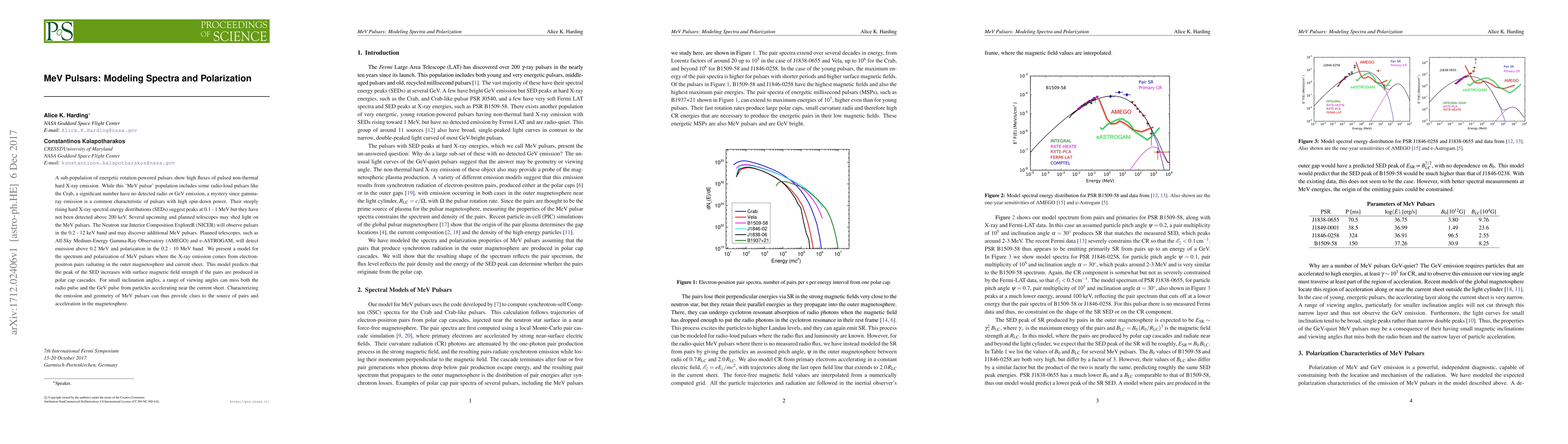 A sub-population of energetic rotation-powered pulsars show high fluxes of pulsed non-thermal hard X-ray emission. While this MeV pulsar population includes some radio-loud pulsars like the Crab, a significant number have no detected radio or GeV emission, a mystery since gamma- ray emission is a common characteristic of pulsars with high spin-down power. Their steeply rising hard X-ray spectral energy distributions (SEDs) suggest peaks at 0.1 - 1 MeV but they have not been detected above 200 keV. Several upcoming and planned telescopes may shed light on the MeV pulsars. The Neutron star Interior Composition ExploreR (NICER) will observe pulsars in the 0.2 - 12 keV band and may discover additional MeV pulsars. Planned telescopes, such as All-Sky Medium-Energy Gamma-Ray Observatory (AMEGO) and e-ASTROGAM, will detect emission above 0.2 MeV and polarization in the 0.2 - 10 MeV band. We present a model for the spectrum and polarization of MeV pulsars where the X-ray emission comes from electron- positron pairs radiating in the outer magnetosphere and current sheet. This model predicts that the peak of the SED increases with surface magnetic field strength if the pairs are produced in polar cap cascades. For small inclination angles, a range of viewing angles can miss both the radio pulse and the GeV pulse from particles accelerating near the current sheet. Characterizing the emission and geometry of MeV pulsars can thus provide clues to the source of pairs and acceleration in the magnetosphere.