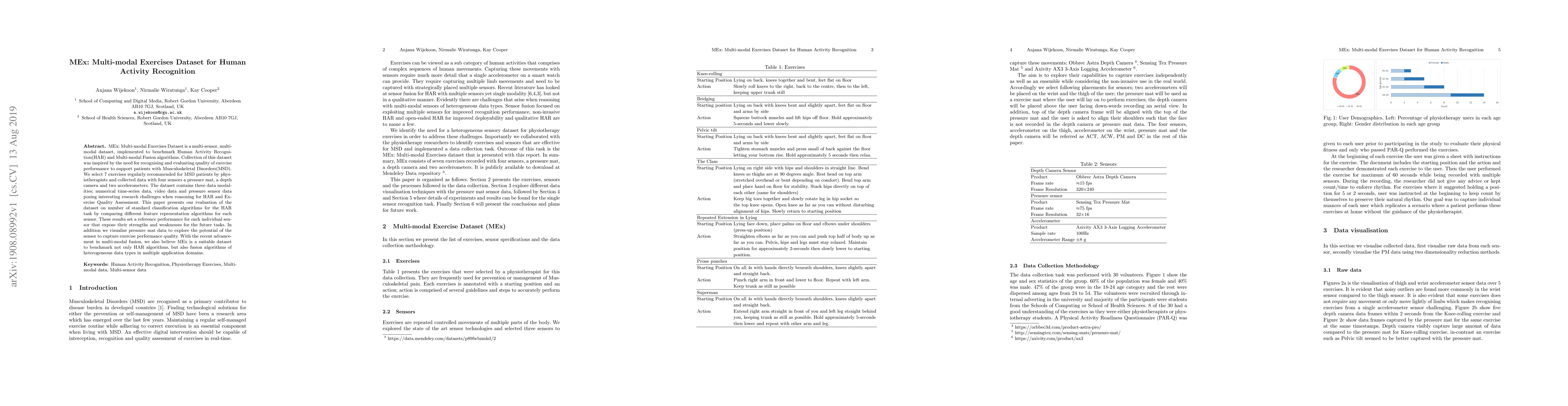 MEx: Multi-modal Exercises Dataset is a multi-sensor, multi-modal dataset, implemented to benchmark Human Activity Recognition(HAR) and Multi-modal Fusion algorithms. Collection of this dataset was inspired by the need for recognising and evaluating quality of exercise performance to support patients with Musculoskeletal Disorders(MSD). We select 7 exercises regularly recommended for MSD patients by physiotherapists and collected data with four sensors a pressure mat, a depth camera and two accelerometers. The dataset contains three data modalities; numerical time-series data, video data and pressure sensor data posing interesting research challenges when reasoning for HAR and Exercise Quality Assessment. This paper presents our evaluation of the dataset on number of standard classification algorithms for the HAR task by comparing different feature representation algorithms for each sensor. These results set a reference performance for each individual sensor that expose their strengths and weaknesses for the future tasks. In addition we visualise pressure mat data to explore the potential of the sensor to capture exercise performance quality. With the recent advancement in multi-modal fusion, we also believe MEx is a suitable dataset to benchmark not only HAR algorithms, but also fusion algorithms of heterogeneous data types in multiple application domains.