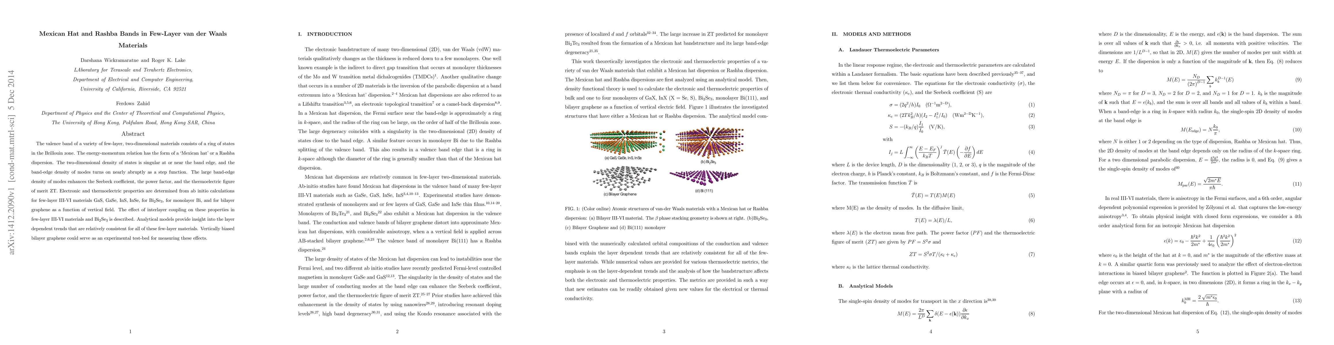 The valence band of a variety of few-layer, two-dimensional materials consists of a ring of states in the Brillouin zone. The energy-momentum relation has the form of a `Mexican hat' or a Rashba dispersion. The two-dimensional density of states is singular at or near the band edge, and the band-edge density of modes turns on nearly abruptly as a step function. The large band-edge density of modes enhances the Seebeck coefficient, the power factor, and the thermoelectric figure of merit ZT. Electronic and thermoelectric properties are determined from ab initio calculations for few-layer III-VI materials GaS, GaSe, InS, InSe, for Bi$_{2}$Se$_{3}$, for monolayer Bi, and for bilayer graphene as a function of vertical field. The effect of interlayer coupling on these properties in few-layer III-VI materials and Bi$_{2}$Se$_{3}$ is described. Analytical models provide insight into the layer dependent trends that are relatively consistent for all of these few-layer materials. Vertically biased bilayer graphene could serve as an experimental test-bed for measuring these effects.