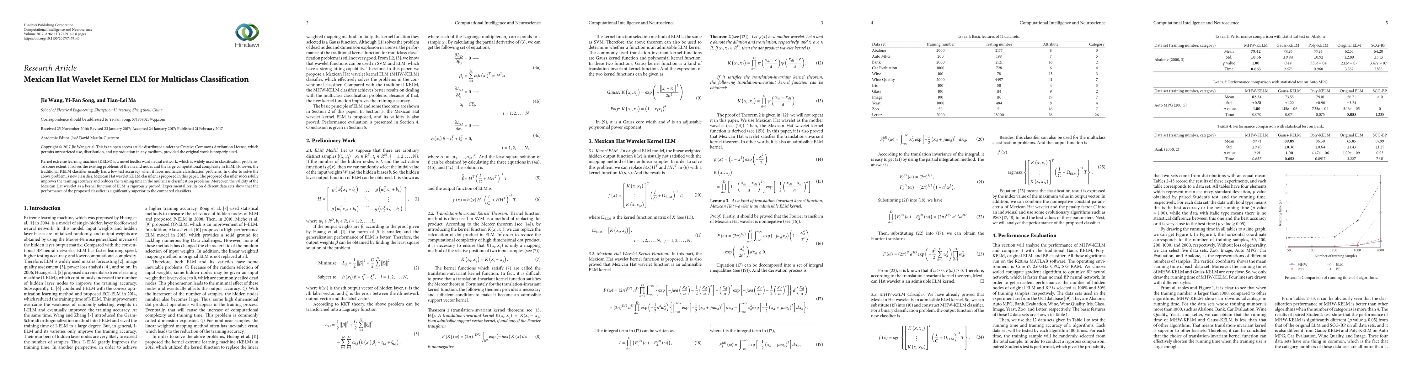 The paper proposes a Mexican Hat wavelet kernel extreme learning machine (KELM) classifier to improve multiclass classification accuracy and reduce training time. The new classifier outperforms traditional KELM and other classifiers, demonstrating the effectiveness of the Mexican Hat wavelet kernel in ELM.
