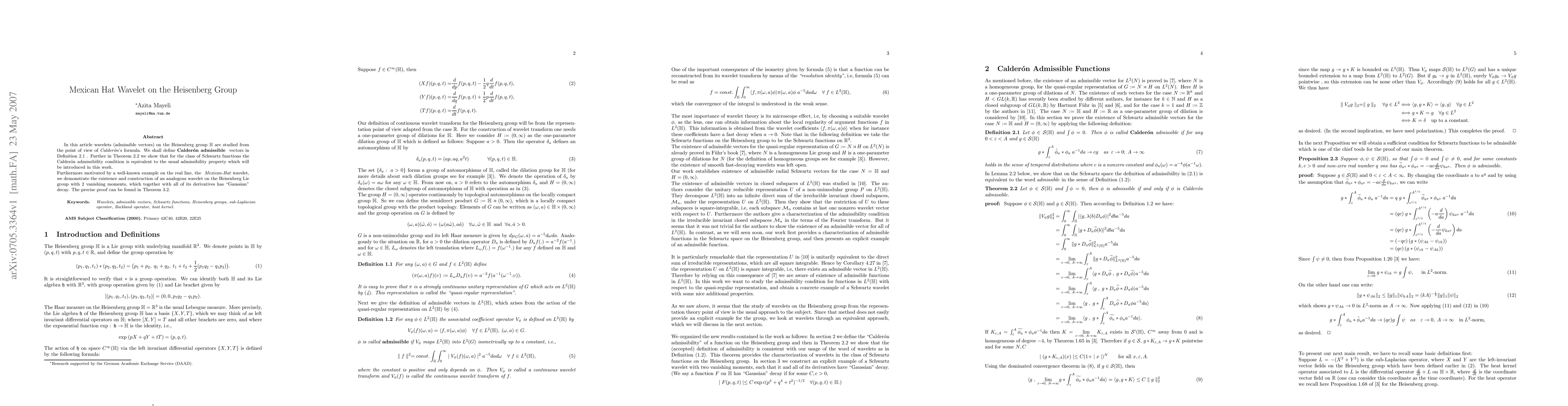 This paper explores wavelets on the Heisenberg group using Calderon's formula, proving equivalence between Calderon admissibility and a newly introduced admissibility property for Schwartz functions. It constructs a Mexican Hat wavelet on the Heisenberg Lie group with 2 vanishing moments, exhibiting Gaussian decay for itself and its derivatives.