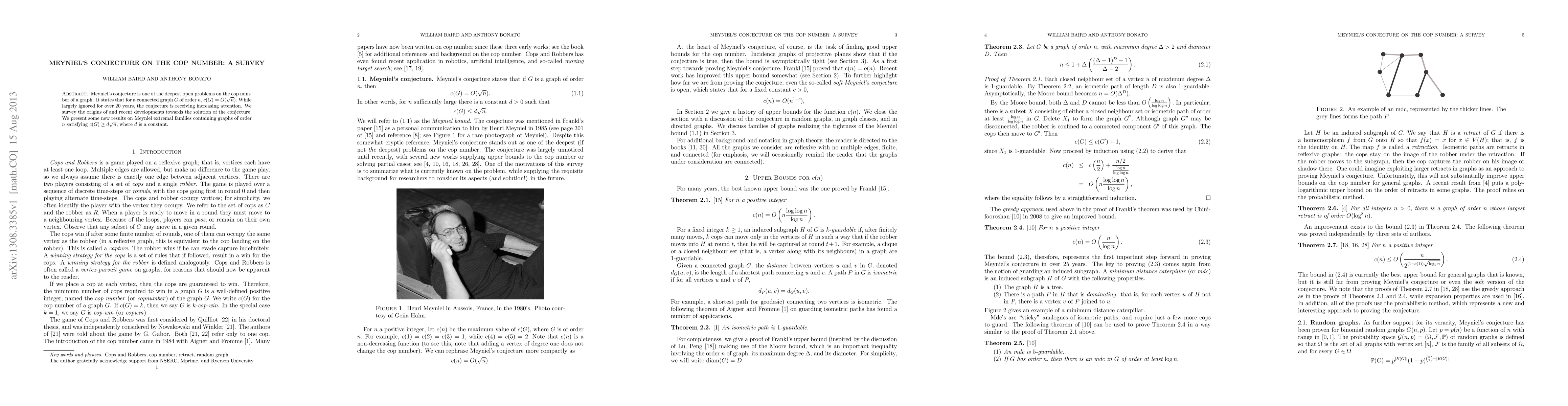 A survey of Meyniel's conjecture on the cop number of a graph reveals recent developments and new results, including extremal families where the cop number exceeds a constant multiple of the square root of the graph size.