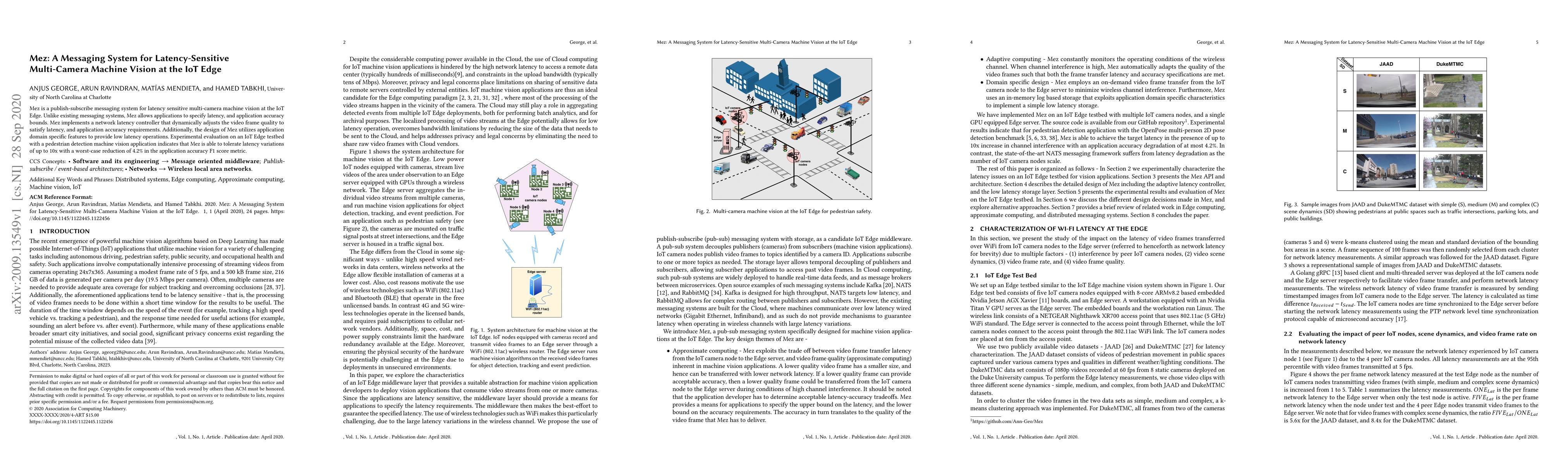 Mez is a publish-subscribe messaging system designed for latency-sensitive multi-camera machine vision applications at the IoT Edge, dynamically adjusting video frame quality to meet specified latency and accuracy requirements. Experimental results show Mez can handle latency variations up to 10x while maintaining application accuracy.