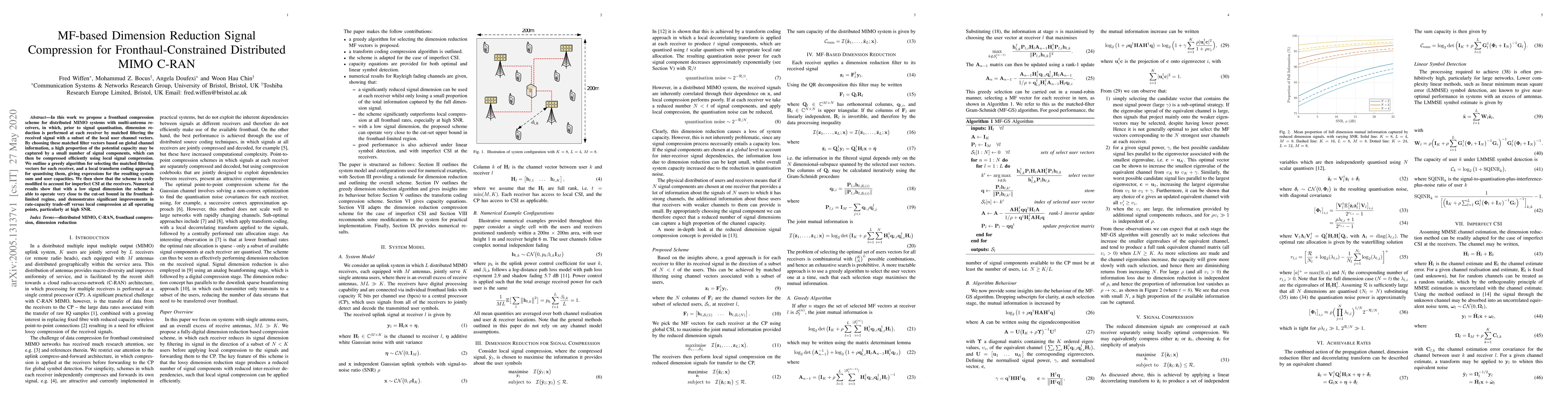 This paper proposes a fronthaul compression scheme for distributed MIMO systems using matched filtering for dimension reduction before quantisation, achieving efficient signal compression and high capacity capture. The scheme employs a greedy algorithm for selecting filtering vectors and local transform coding, showing significant rate-capacity improvements, especially at high SNR.