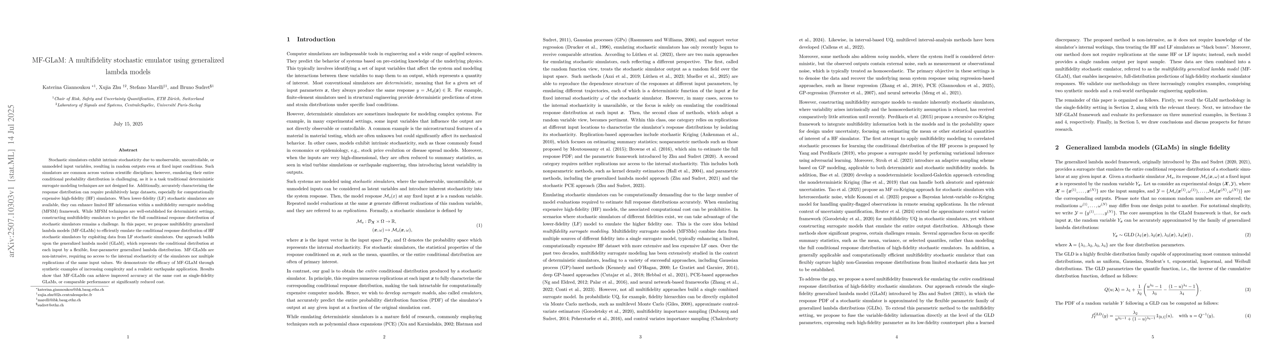 Stochastic simulators exhibit intrinsic stochasticity due to unobservable, uncontrollable, or unmodeled input variables, resulting in random outputs even at fixed input conditions. Such simulators are common across various scientific disciplines; however, emulating their entire conditional probability distribution is challenging, as it is a task traditional deterministic surrogate modeling techniques are not designed for. Additionally, accurately characterizing the response distribution can require prohibitively large datasets, especially for computationally expensive high-fidelity (HF) simulators. When lower-fidelity (LF) stochastic simulators are available, they can enhance limited HF information within a multifidelity surrogate modeling (MFSM) framework. While MFSM techniques are well-established for deterministic settings, constructing multifidelity emulators to predict the full conditional response distribution of stochastic simulators remains a challenge. In this paper, we propose multifidelity generalized lambda models (MF-GLaMs) to efficiently emulate the conditional response distribution of HF stochastic simulators by exploiting data from LF stochastic simulators. Our approach builds upon the generalized lambda model (GLaM), which represents the conditional distribution at each input by a flexible, four-parameter generalized lambda distribution. MF-GLaMs are non-intrusive, requiring no access to the internal stochasticity of the simulators nor multiple replications of the same input values. We demonstrate the efficacy of MF-GLaM through synthetic examples of increasing complexity and a realistic earthquake application. Results show that MF-GLaMs can achieve improved accuracy at the same cost as single-fidelity GLaMs, or comparable performance at significantly reduced cost.