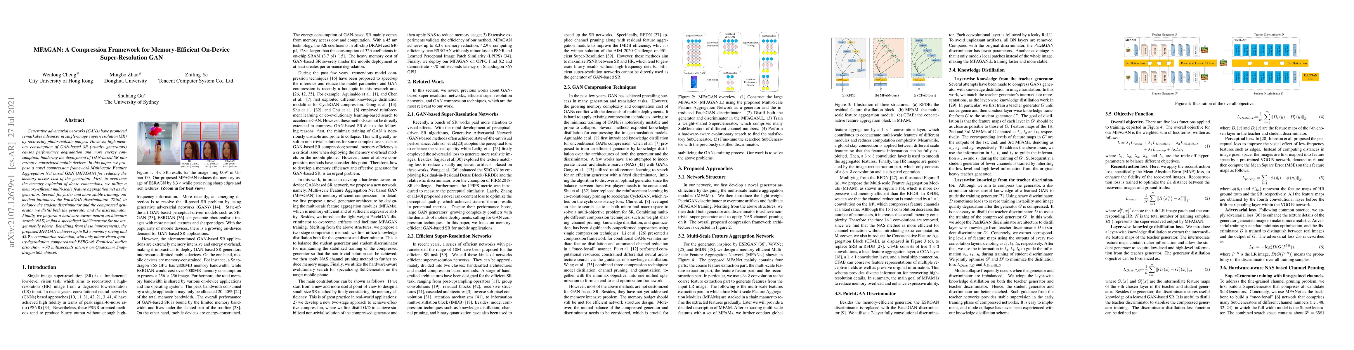 Generative adversarial networks (GANs) have promoted remarkable advances in single-image super-resolution (SR) by recovering photo-realistic images. However, high memory consumption of GAN-based SR (usually generators) causes performance degradation and more energy consumption, hindering the deployment of GAN-based SR into resource-constricted mobile devices. In this paper, we propose a novel compression framework \textbf{M}ulti-scale \textbf{F}eature \textbf{A}ggregation Net based \textbf{GAN} (MFAGAN) for reducing the memory access cost of the generator. First, to overcome the memory explosion of dense connections, we utilize a memory-efficient multi-scale feature aggregation net as the generator. Second, for faster and more stable training, our method introduces the PatchGAN discriminator. Third, to balance the student discriminator and the compressed generator, we distill both the generator and the discriminator. Finally, we perform a hardware-aware neural architecture search (NAS) to find a specialized SubGenerator for the target mobile phone. Benefiting from these improvements, the proposed MFAGAN achieves up to \textbf{8.3}$\times$ memory saving and \textbf{42.9}$\times$ computation reduction, with only minor visual quality degradation, compared with ESRGAN. Empirical studies also show $\sim$\textbf{70} milliseconds latency on Qualcomm Snapdragon 865 chipset.