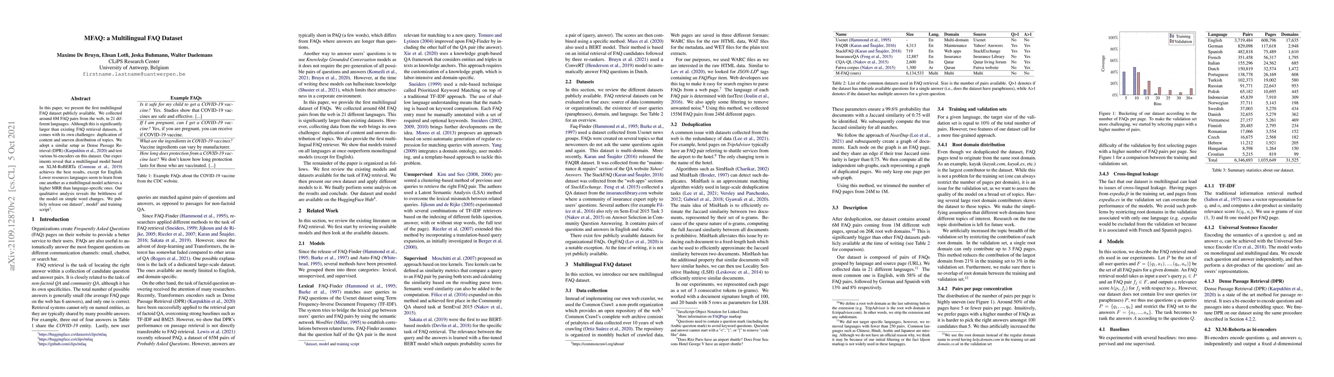 This paper introduces a large multilingual FAQ dataset comprising 6 million FAQ pairs in 21 languages, addressing challenges like content duplication and uneven topic distribution. Experiments show that a multilingual model based on XLM-RoBERTa performs best, especially for lower-resource languages, though it struggles with minor word changes. The dataset, model, and training script are publicly released.