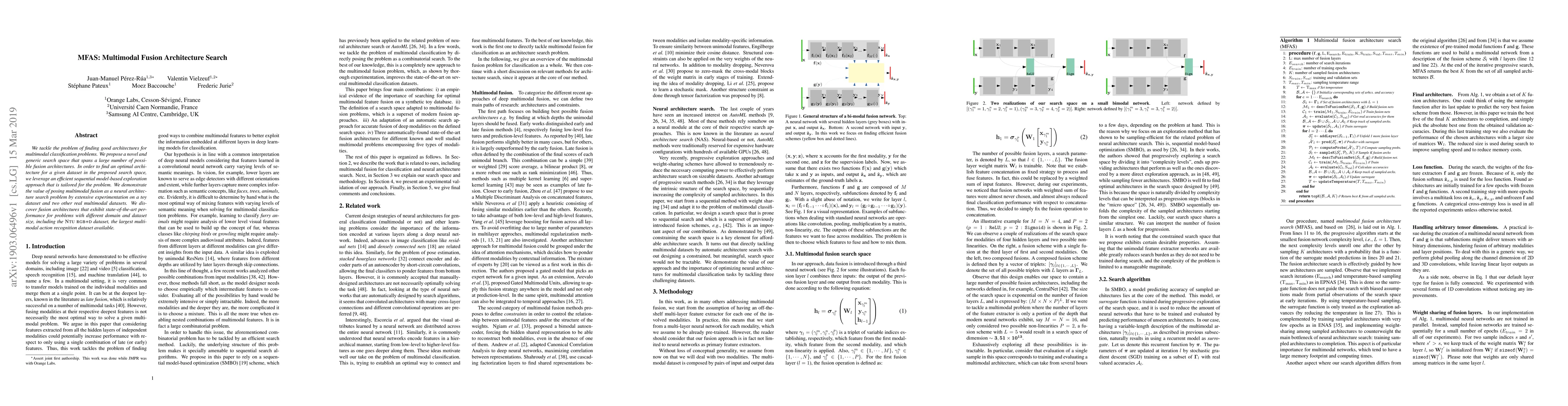 The paper proposes MFAS, a novel architecture search method for finding optimal multimodal fusion architectures for classification tasks. Through extensive experimentation on various datasets, including the large NTU RGB+D dataset, it demonstrates state-of-the-art performance across different domains and dataset sizes.