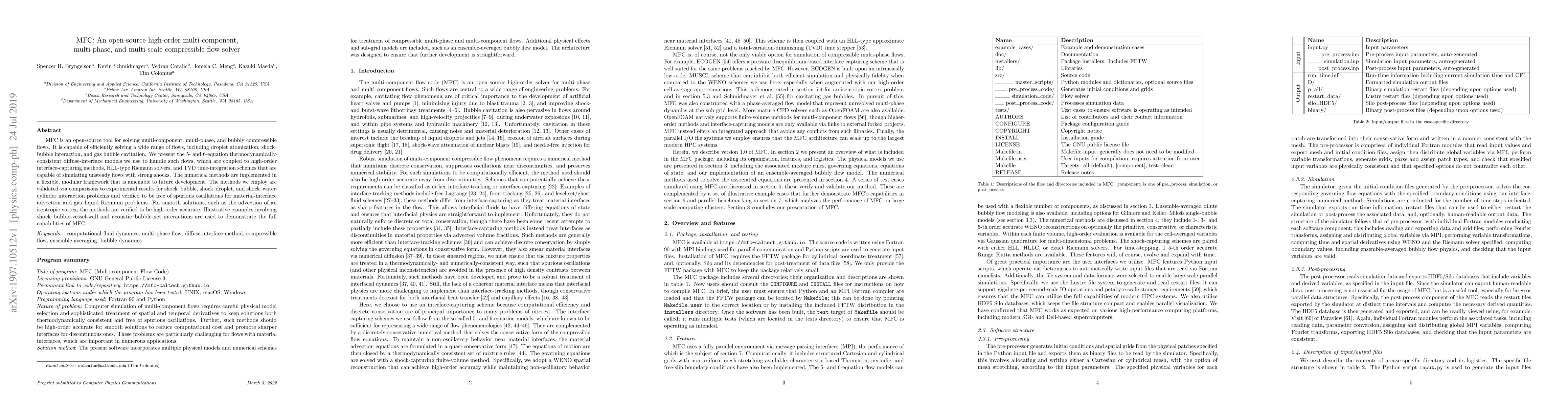 MFC is an open-source solver for complex compressible flows involving multiple components, phases, and scales, validated against experimental results and verified for high-order accuracy and stability. It employs advanced numerical methods to simulate phenomena like droplet atomization and shock interactions.