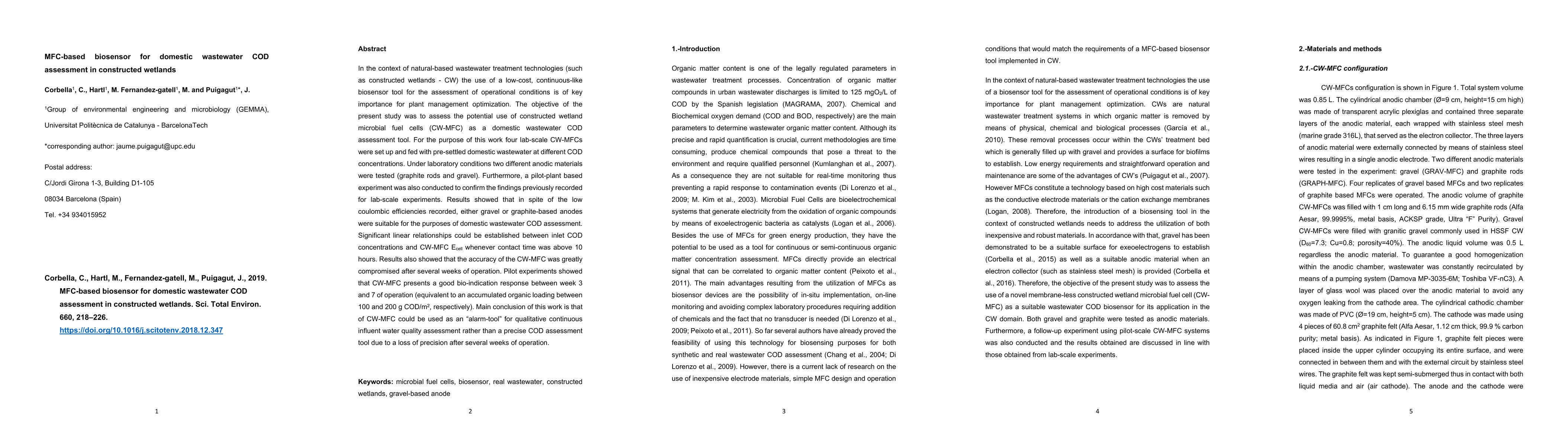 This study evaluates constructed wetland microbial fuel cells (CW-MFC) as a low-cost biosensor for assessing domestic wastewater COD in constructed wetlands. Results indicate CW-MFCs can provide a qualitative assessment of COD but lose precision after several weeks, making them more suitable as an "alarm-tool" for monitoring influent water quality.
