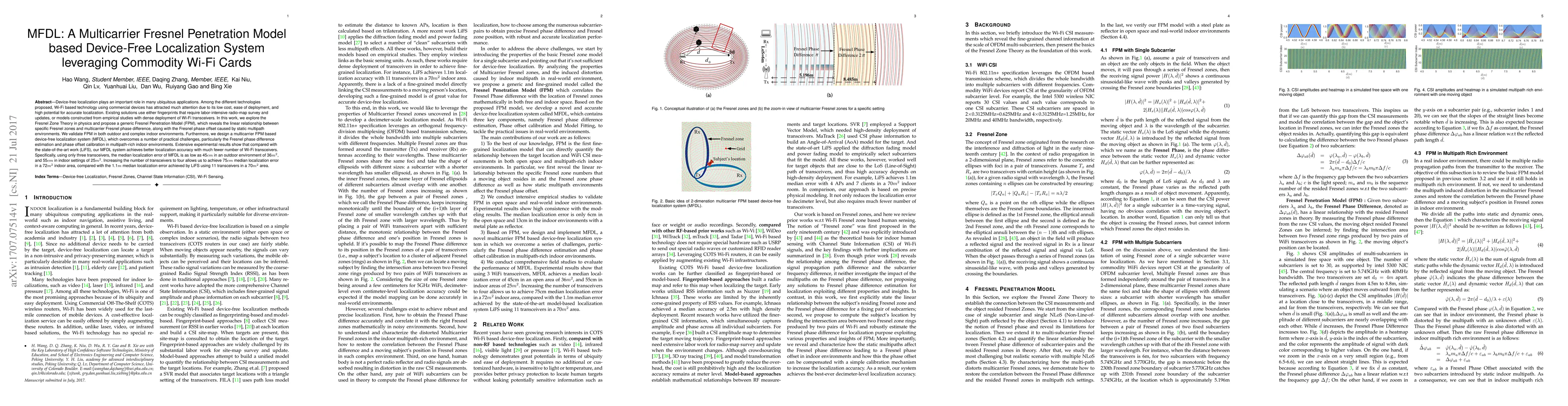 This paper presents MFDL, a cost-effective device-free localization system leveraging Fresnel Zone Theory and multicarrier signals from commodity Wi-Fi cards. It achieves high accuracy with fewer transceivers compared to existing methods, demonstrating median localization errors of 45 cm outdoors and 55 cm indoors using just three transceivers.