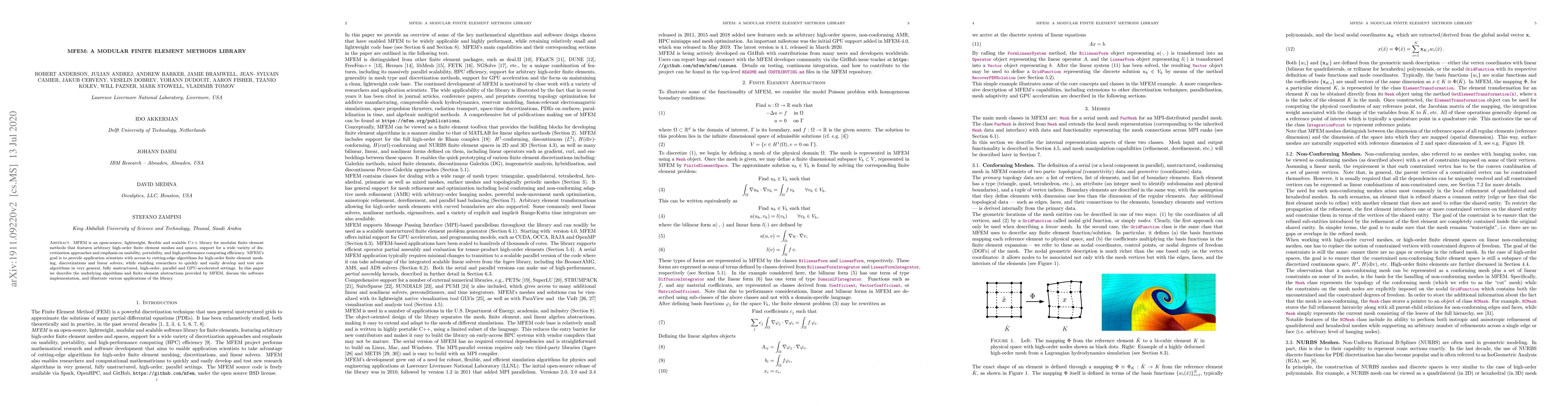 MFEM is an open-source C++ library designed for modular finite element methods, offering high-order meshing and discretization support, and emphasizing usability and high-performance computing. It enables researchers to develop and test new algorithms in parallel and GPU-accelerated environments.