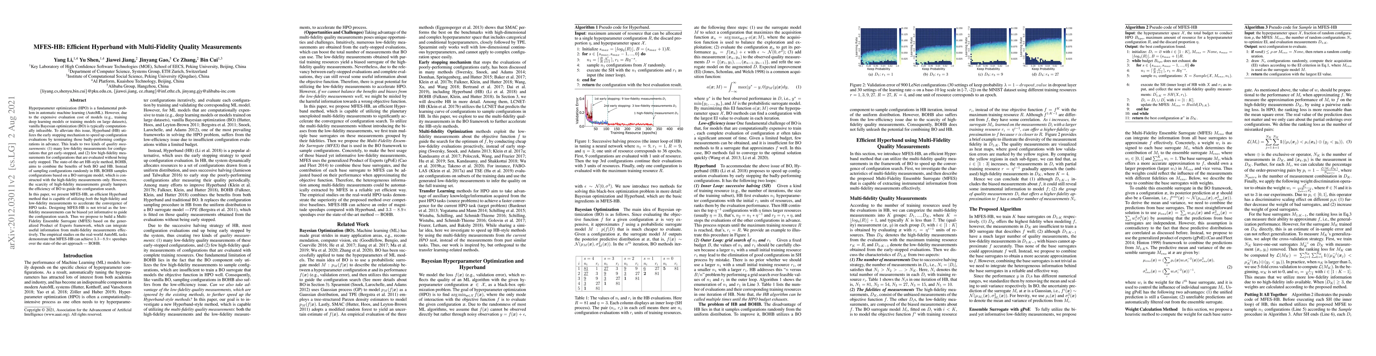 MFES-HB is an efficient Hyperband method that leverages both high-fidelity and low-fidelity measurements to accelerate hyperparameter optimization. It employs a Multi-Fidelity Ensemble Surrogate (MFES) to integrate these measurements effectively, achieving 3.3-8.9x speedups over the state-of-the-art BOHB method in real-world AutoML tasks.