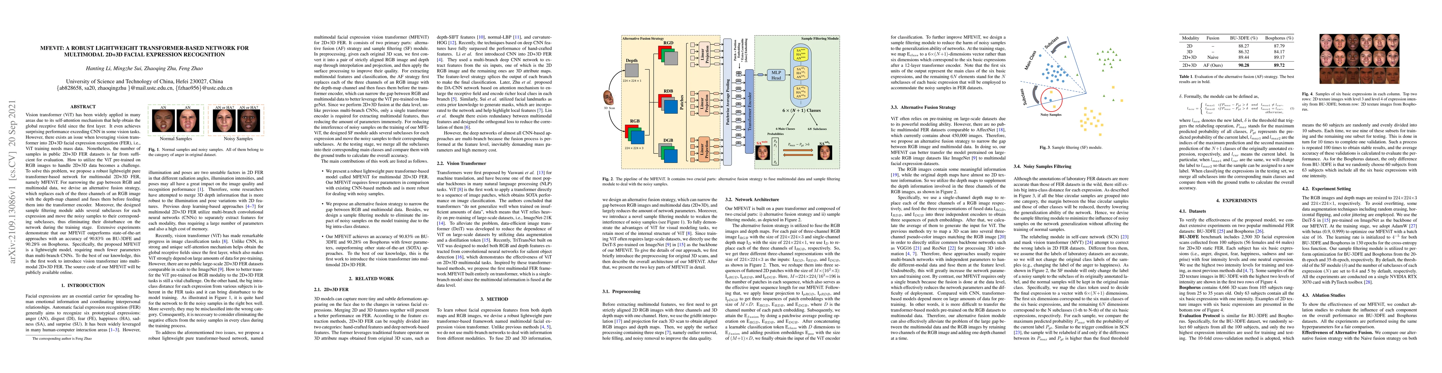 The paper introduces MFEViT, a lightweight transformer-based network for multimodal 2D+3D facial expression recognition, addressing the challenge of limited training data. It employs an alternative fusion strategy to bridge RGB and multimodal data and a sample filtering module to reduce noise, achieving state-of-the-art performance with fewer parameters.