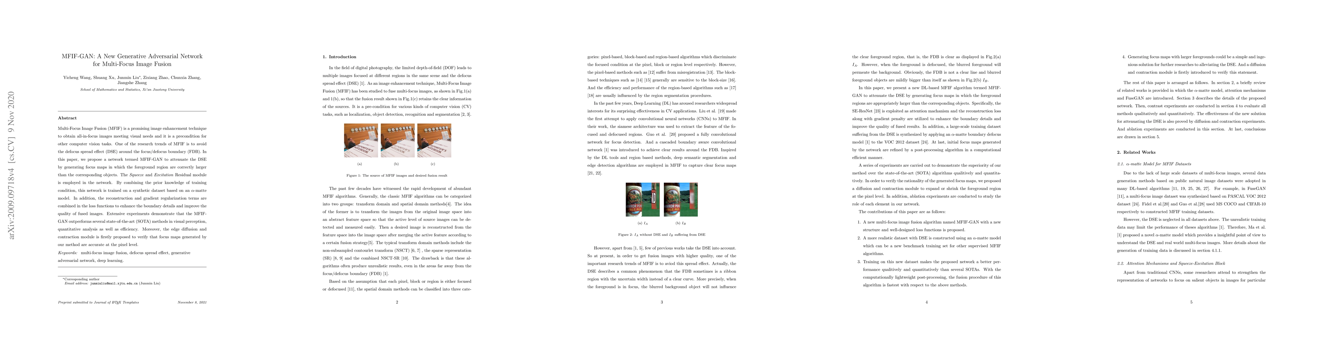 The paper introduces MFIF-GAN, a novel GAN designed to enhance multi-focus image fusion by minimizing defocus spread effect, employing a Squeeze and Excitation Residual module and gradient regularization to improve fused image quality and efficiency. Experimental results show superior performance compared to state-of-the-art methods.