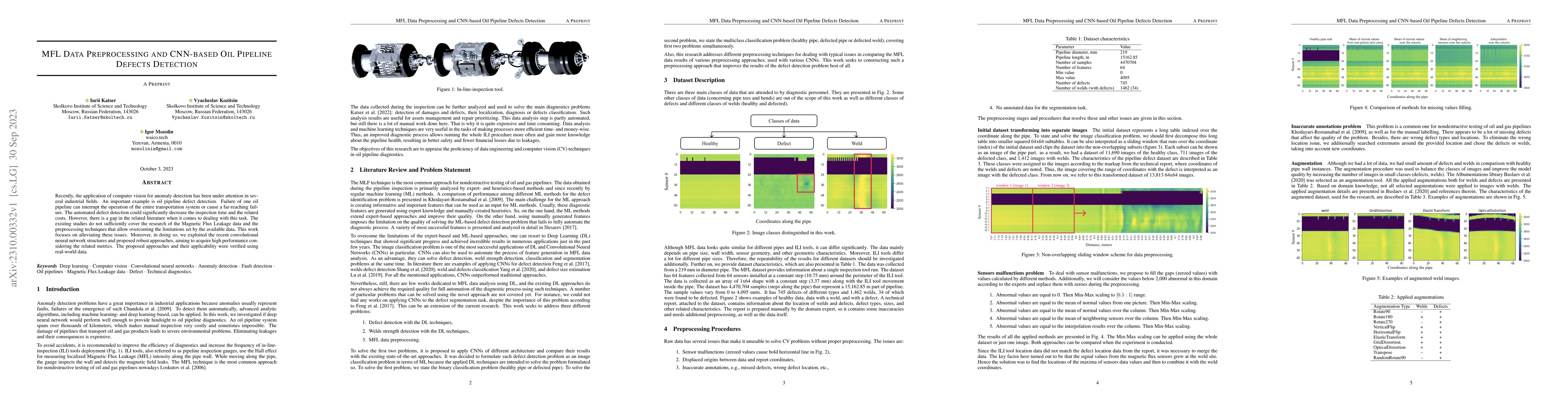 This paper addresses the challenge of oil pipeline defect detection using Magnetic Flux Leakage data, emphasizing the need for effective preprocessing techniques. It proposes convolutional neural network-based methods to achieve high-performance defect detection, validated with real-world data.