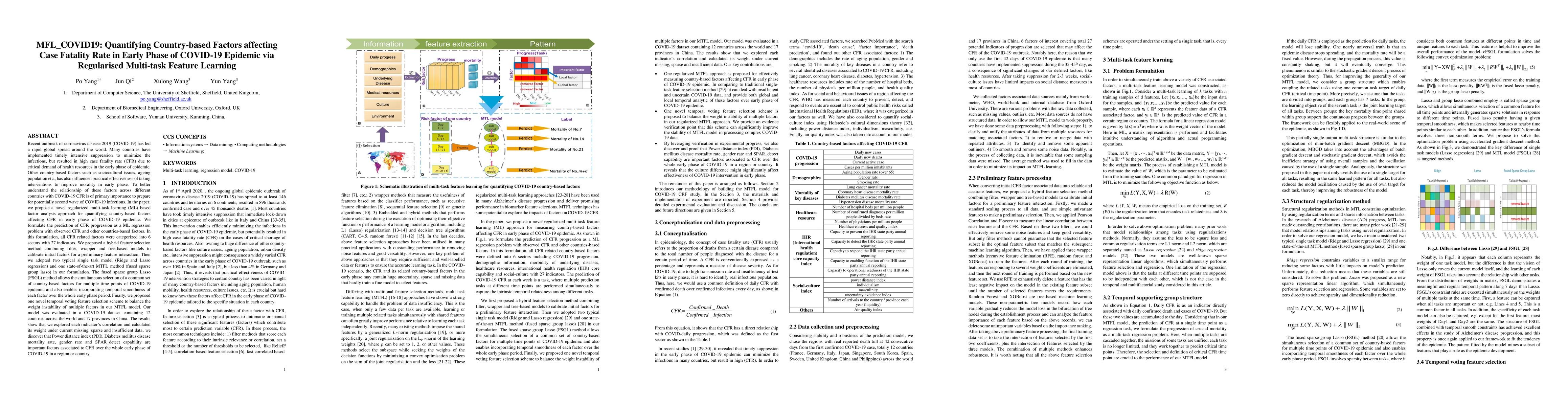 Recent outbreak of COVID-19 has led a rapid global spread around the world. Many countries have implemented timely intensive suppression to minimize the infections, but resulted in high case fatality rate (CFR) due to critical demand of health resources. Other country-based factors such as sociocultural issues, ageing population etc., has also influenced practical effectiveness of taking interventions to improve morality in early phase. To better understand the relationship of these factors across different countries with COVID-19 CFR is of primary importance to prepare for potentially second wave of COVID-19 infections. In the paper, we propose a novel regularized multi-task learning based factor analysis approach for quantifying country-based factors affecting CFR in early phase of COVID-19 epidemic. We formulate the prediction of CFR progression as a ML regression problem with observed CFR and other countries-based factors. In this formulation, all CFR related factors were categorized into 6 sectors with 27 indicators. We proposed a hybrid feature selection method combining filter, wrapper and tree-based models to calibrate initial factors for a preliminary feature interaction. Then we adopted two typical single task model (Ridge and Lasso regression) and one state-of-the-art MTFL method (fused sparse group lasso) in our formulation. The fused sparse group Lasso (FSGL) method allows the simultaneous selection of a common set of country-based factors for multiple time points of COVID-19 epidemic and also enables incorporating temporal smoothness of each factor over the whole early phase period. Finally, we proposed one novel temporal voting feature selection scheme to balance the weight instability of multiple factors in our MTFL model.