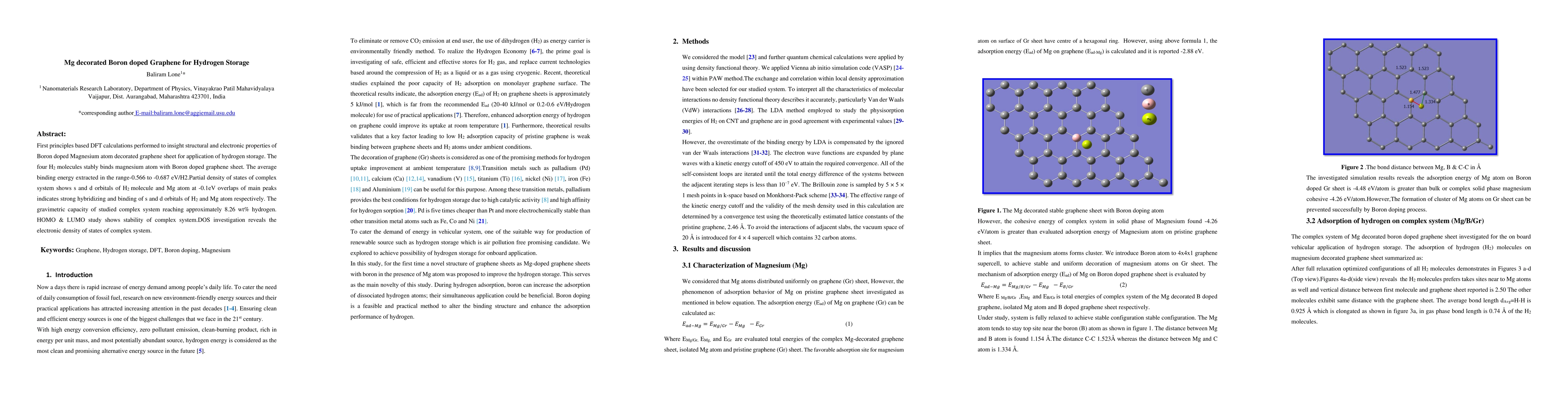 The study demonstrates the potential of Mg decorated Boron doped Graphene for Hydrogen Storage, with significant implications for energy applications