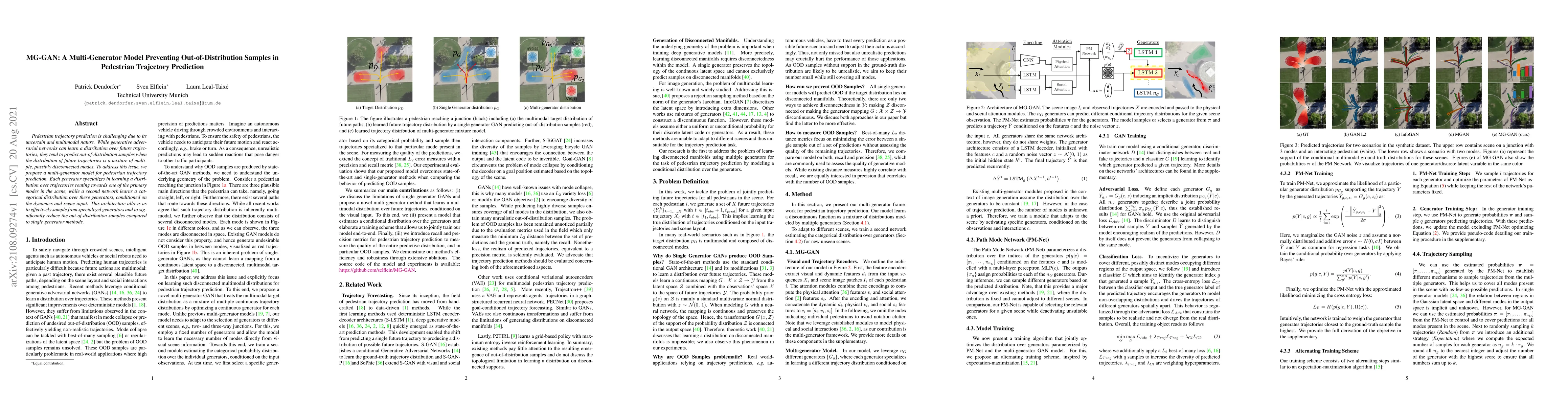 The MG-GAN model introduces a multi-generator approach to improve pedestrian trajectory prediction by reducing out-of-distribution samples. Each generator specializes in a particular trajectory mode, while a second network selects the appropriate generator based on scene dynamics, thus significantly lowering the prediction errors compared to single-generator GANs.