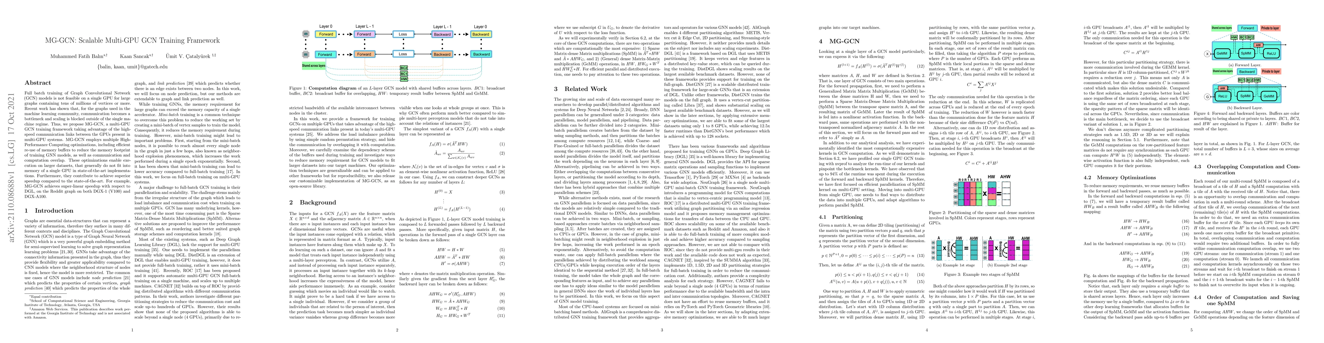 Full batch training of Graph Convolutional Network (GCN) models is not feasible on a single GPU for large graphs containing tens of millions of vertices or more. Recent work has shown that, for the graphs used in the machine learning community, communication becomes a bottleneck and scaling is blocked outside of the single machine regime. Thus, we propose MG-GCN, a multi-GPU GCN training framework taking advantage of the high-speed communication links between the GPUs present in multi-GPU systems. MG-GCN employs multiple High-Performance Computing optimizations, including efficient re-use of memory buffers to reduce the memory footprint of training GNN models, as well as communication and computation overlap. These optimizations enable execution on larger datasets, that generally do not fit into memory of a single GPU in state-of-the-art implementations. Furthermore, they contribute to achieve superior speedup compared to the state-of-the-art. For example, MG-GCN achieves super-linear speedup with respect to DGL, on the Reddit graph on both DGX-1 (V100) and DGX-A100.