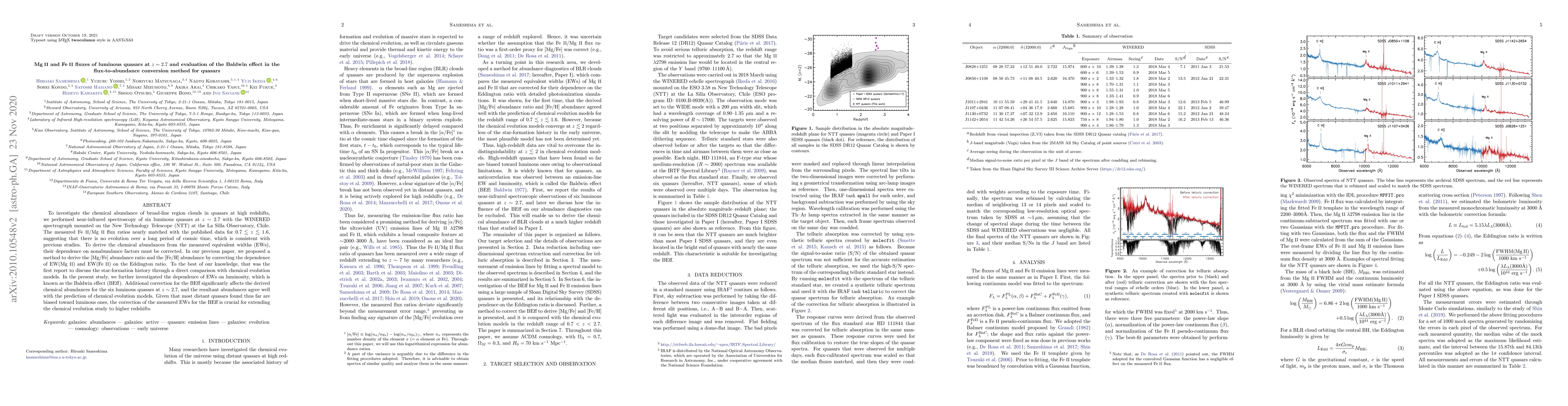 The research utilized near-infrared spectroscopy with the WINERED spectrograph on the New Technology Telescope (NTT) at the La Silla Observatory, Chile, to measure Mg II and Fe II flux ratios in six luminous quasars at z ~ 2.7. The study combined these spectra with SDSS optical spectra to analyze EW(Mg II) and EW(Fe II) and correct for non-abundance factors, including the Baldwin effect (BEff) and the Eddington ratio.
