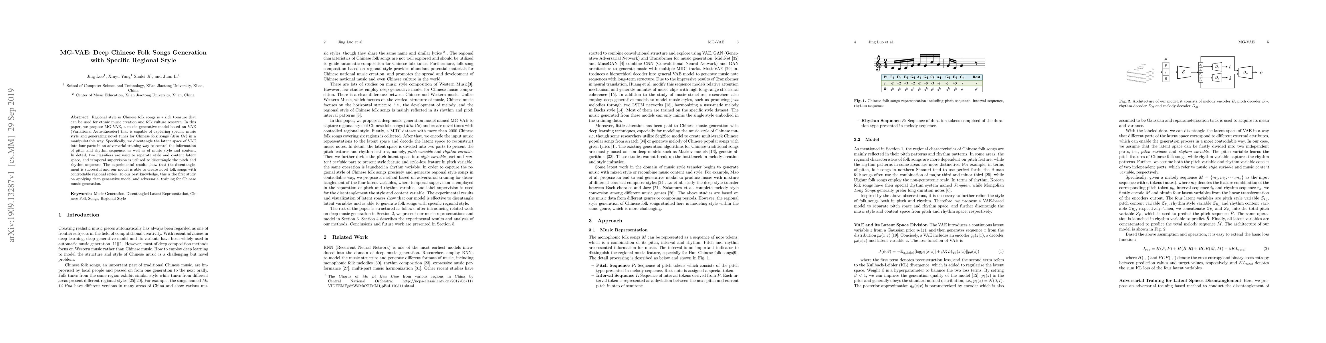This paper introduces MG-VAE, a Variational Auto-Encoder model for generating Chinese folk songs with specific regional styles. It disentangles the latent space to control pitch, rhythm, style, and content, achieving successful regional style generation and novel tune creation.