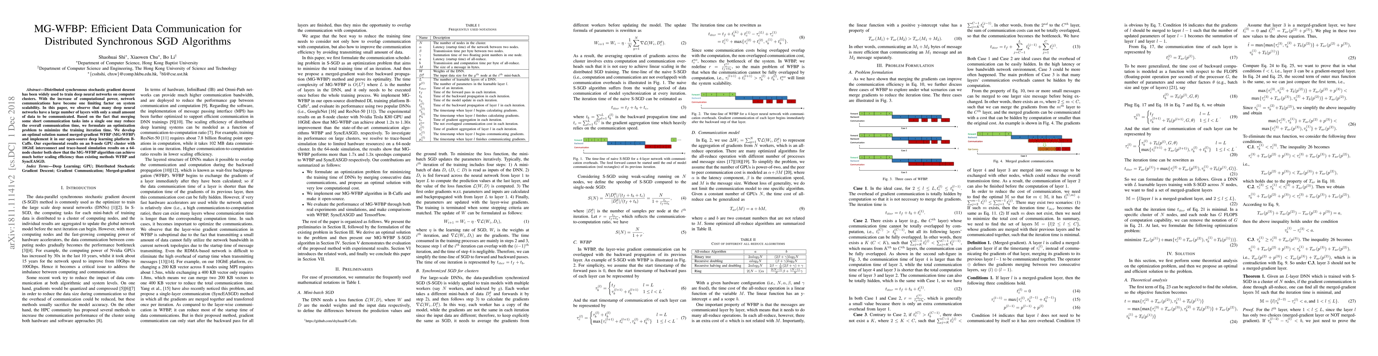 Distributed synchronous stochastic gradient descent has been widely used to train deep neural networks on computer clusters. With the increase of computational power, network communications have become one limiting factor on system scalability. In this paper, we observe that many deep neural networks have a large number of layers with only a small amount of data to be communicated. Based on the fact that merging some short communication tasks into a single one may reduce the overall communication time, we formulate an optimization problem to minimize the training iteration time. We develop an optimal solution named merged-gradient WFBP (MG-WFBP) and implement it in our open-source deep learning platform B-Caffe. Our experimental results on an 8-node GPU cluster with 10GbE interconnect and trace-based simulation results on a 64-node cluster both show that the MG-WFBP algorithm can achieve much better scaling efficiency than existing methods WFBP and SyncEASGD.