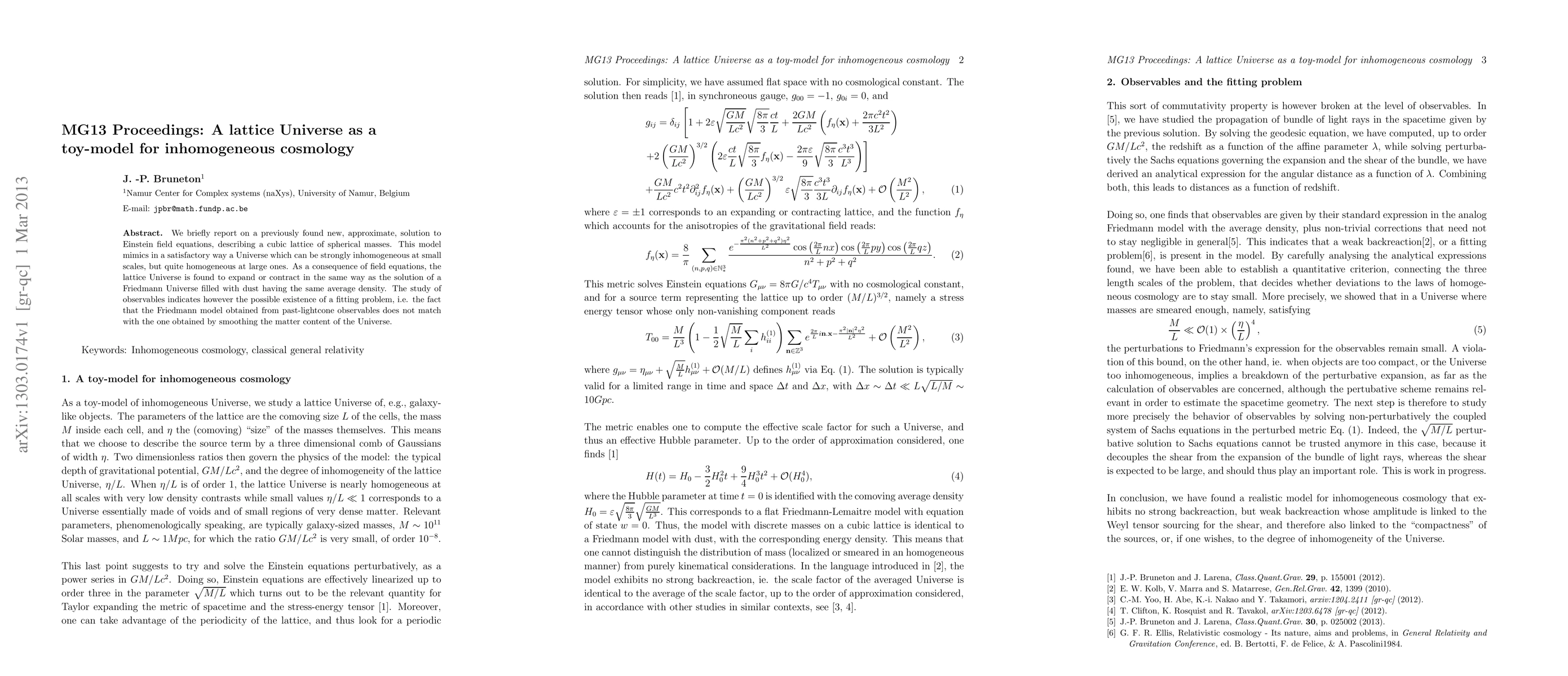 We briefly report on a previously found new, approximate, solution to Einstein field equations, describing a cubic lattice of spherical masses. This model mimics in a satisfactory way a Universe which can be strongly inhomogeneous at small scales, but quite homogeneous at large ones. As a consequence of field equations, the lattice Universe is found to expand or contract in the same way as the solution of a Friedmann Universe filled with dust having the same average density. The study of observables indicates however the possible existence of a fitting problem, i.e. the fact that the Friedmann model obtained from past-lightcone observables does not match with the one obtained by smoothing the matter content of the Universe.