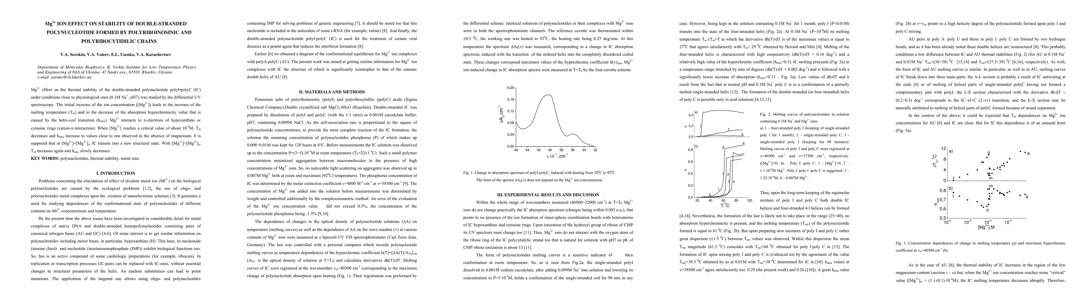 Mg2+ effect on the thermal stability of the double-stranded polynucleotide polyIpolyC (IC) under conditions close to physiological ones (0.1M Na+, pH7) was studied by the differential UV spectroscopy. The initial increase of the ion concentration ([Mg2+]) leads to the increase of the melting temperature (Tm) and to the decrease of the absorption hyperchromicity value that is caused by the helix-coil transition (hmax). Mg2+ interacts to p-electrons of hypoxanthine or cytosine rings (cation-p-interaction). When [Mg2+] reaches a critical value of about 10-4 M, Tm decreases and hmax increase to values close to one observed in the absence of magnesium. It is supposed that at [Mg2+]=[Mg2+]cr IC transits into a new structural state. With [Mg2+>[Mg2+]cr Tm increases again and hmax slowly decreases. Key words: polynucleotides, thermal stability, metal ions.